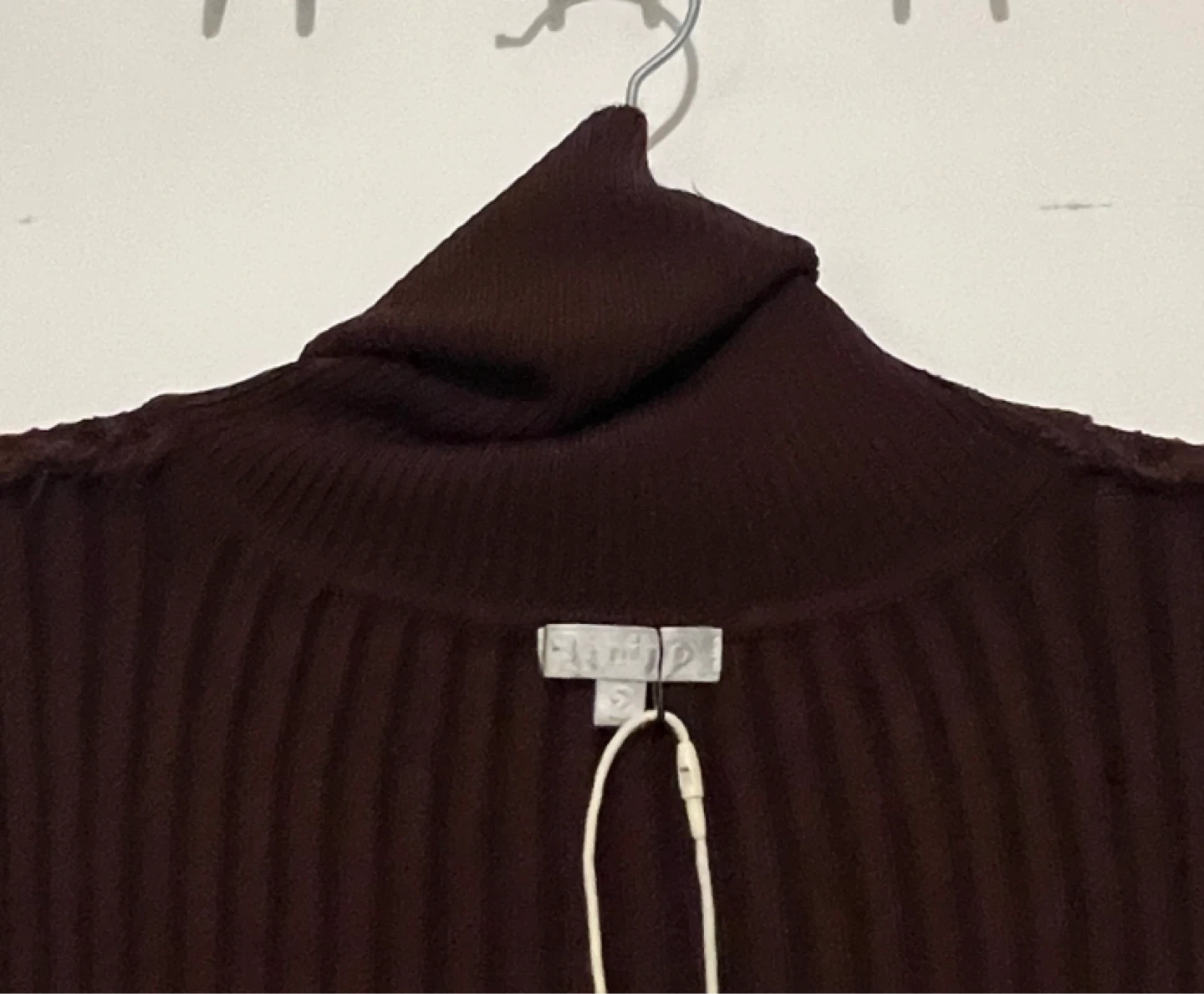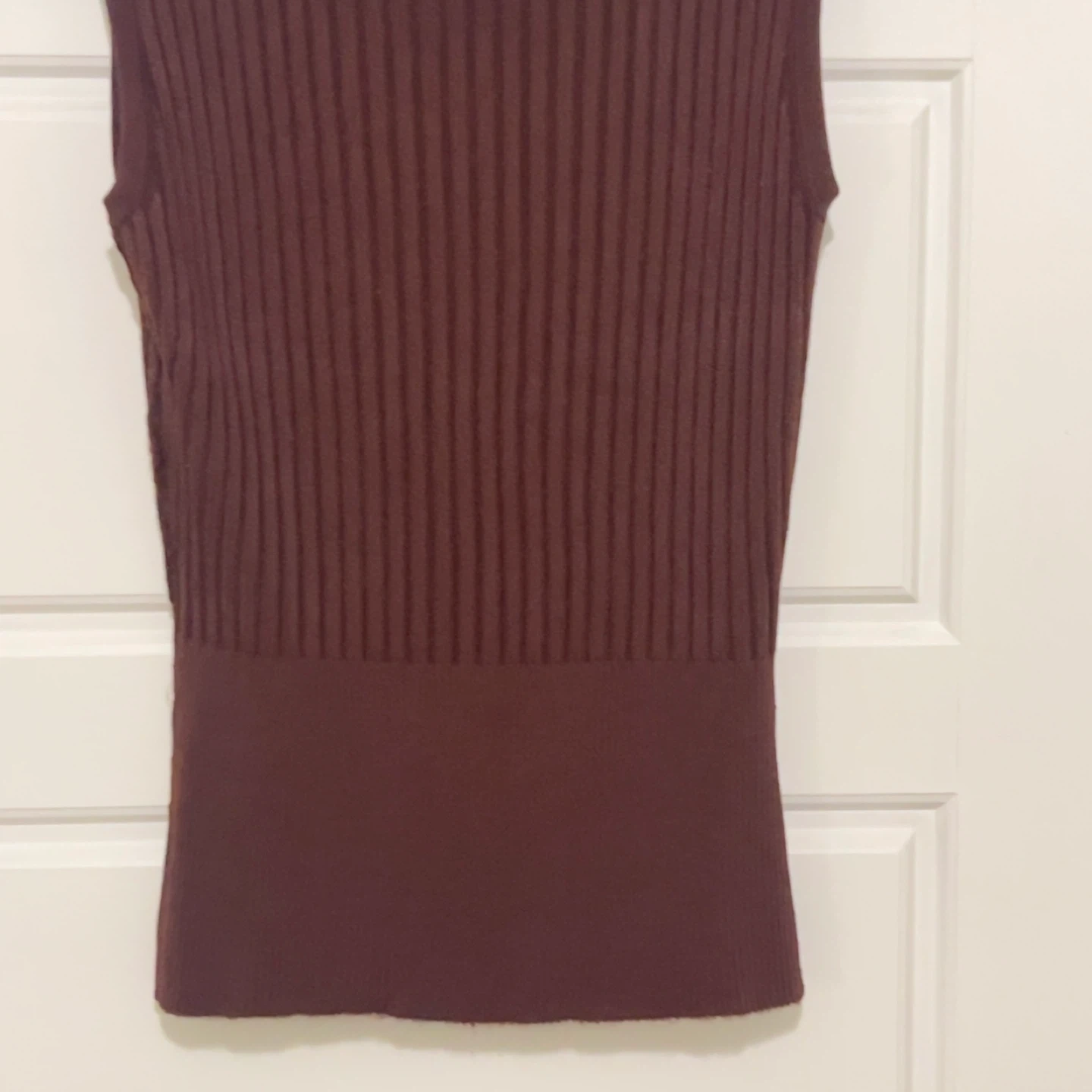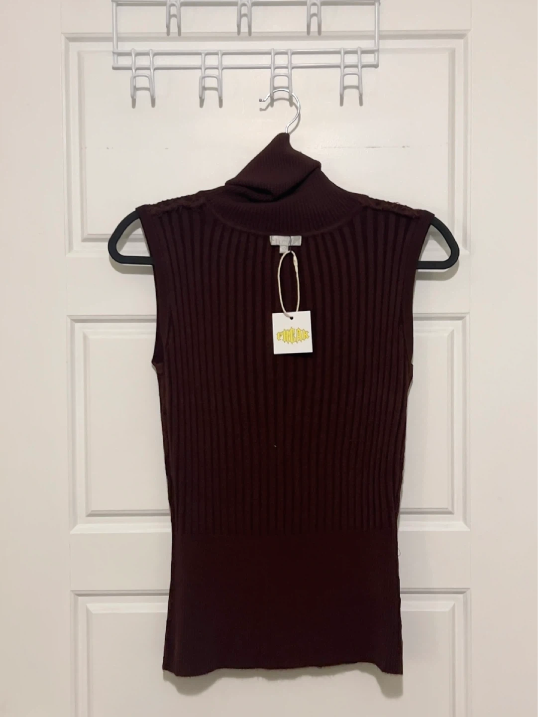 A sleeveless turtleneck top in a rich brown colour. It's made of a ribbed stretchy knit material. Perfect for layering or wearing on its own!