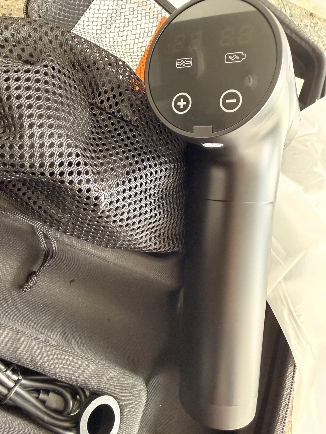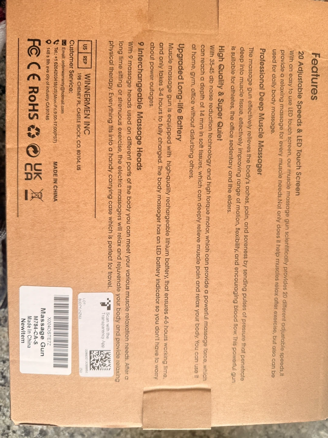 New- box open but never used- This massage gun features 20 adjustable speeds and LED touch screen. It's equipped with a high-quality rechargeable battery, offering up to 4 hours of working time. It includes 9 interchangeable massage heads for various muscle relaxation needs. It's great for professionals and everyday use!