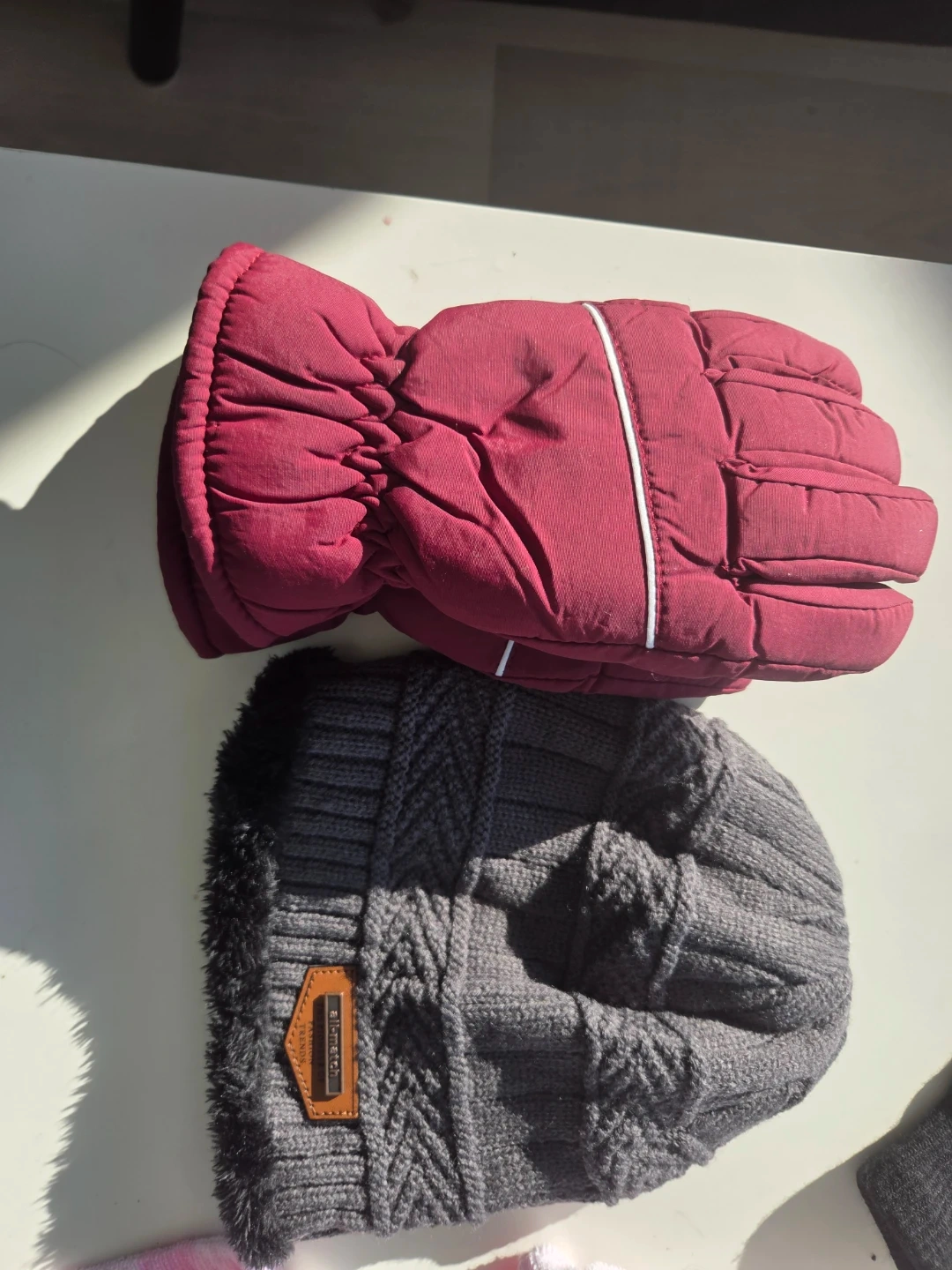 This is a warm winter hat and glove set. The hat is grey with a faux fur lining and a knitted texture. The gloves are a deep red colour and appear to be insulated.