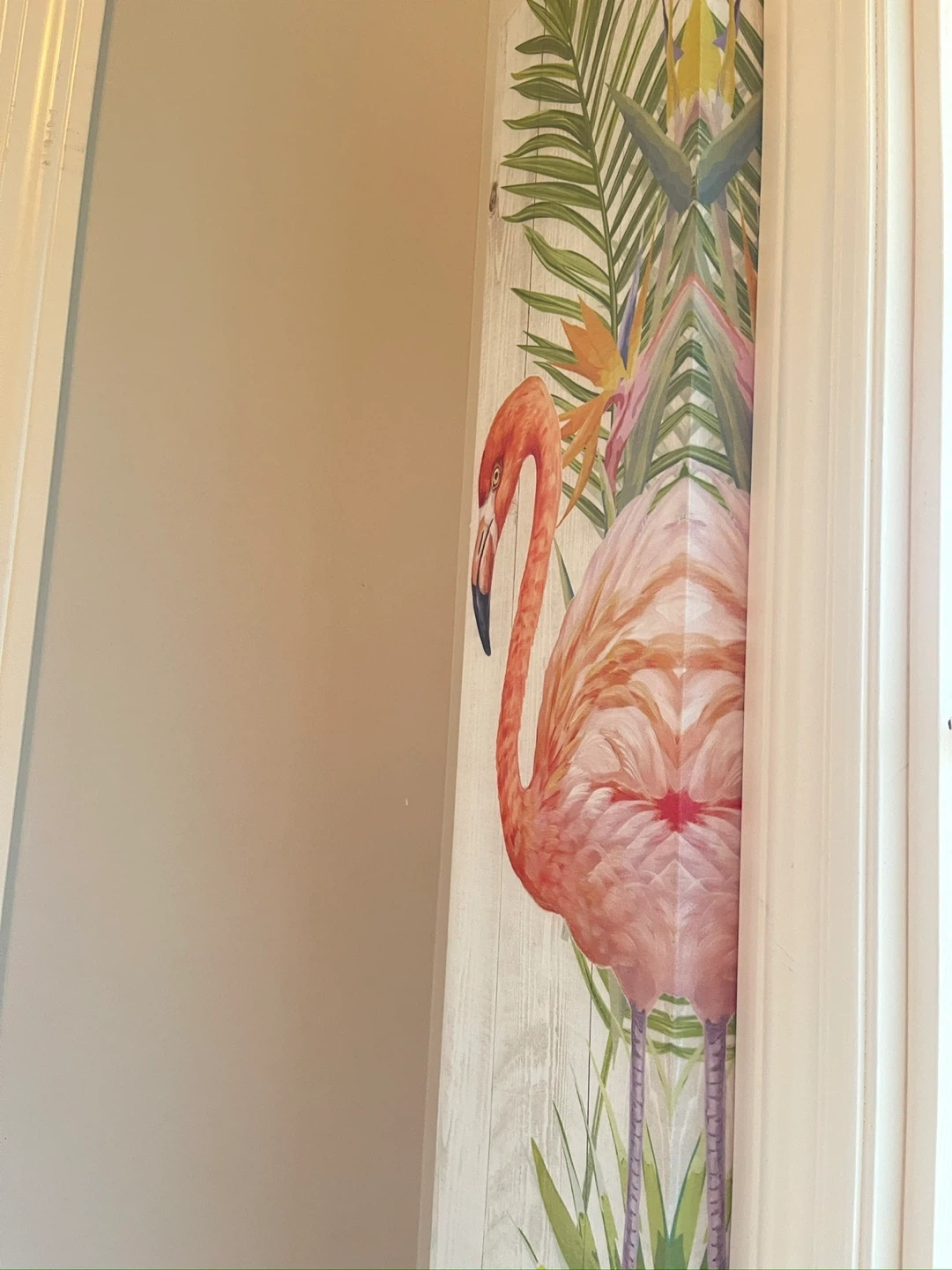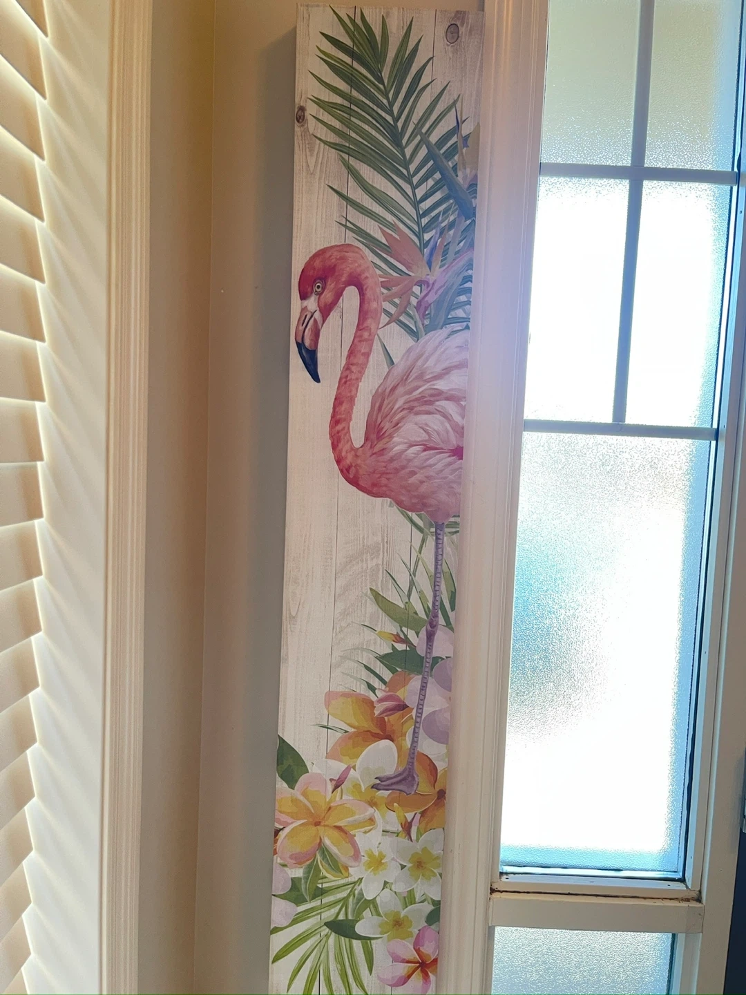 A fun flamingo wall decor piece! It features a flamingo with tropical leaves and flowers on a white wood-look background. Perfect for adding a touch of the tropics to any room