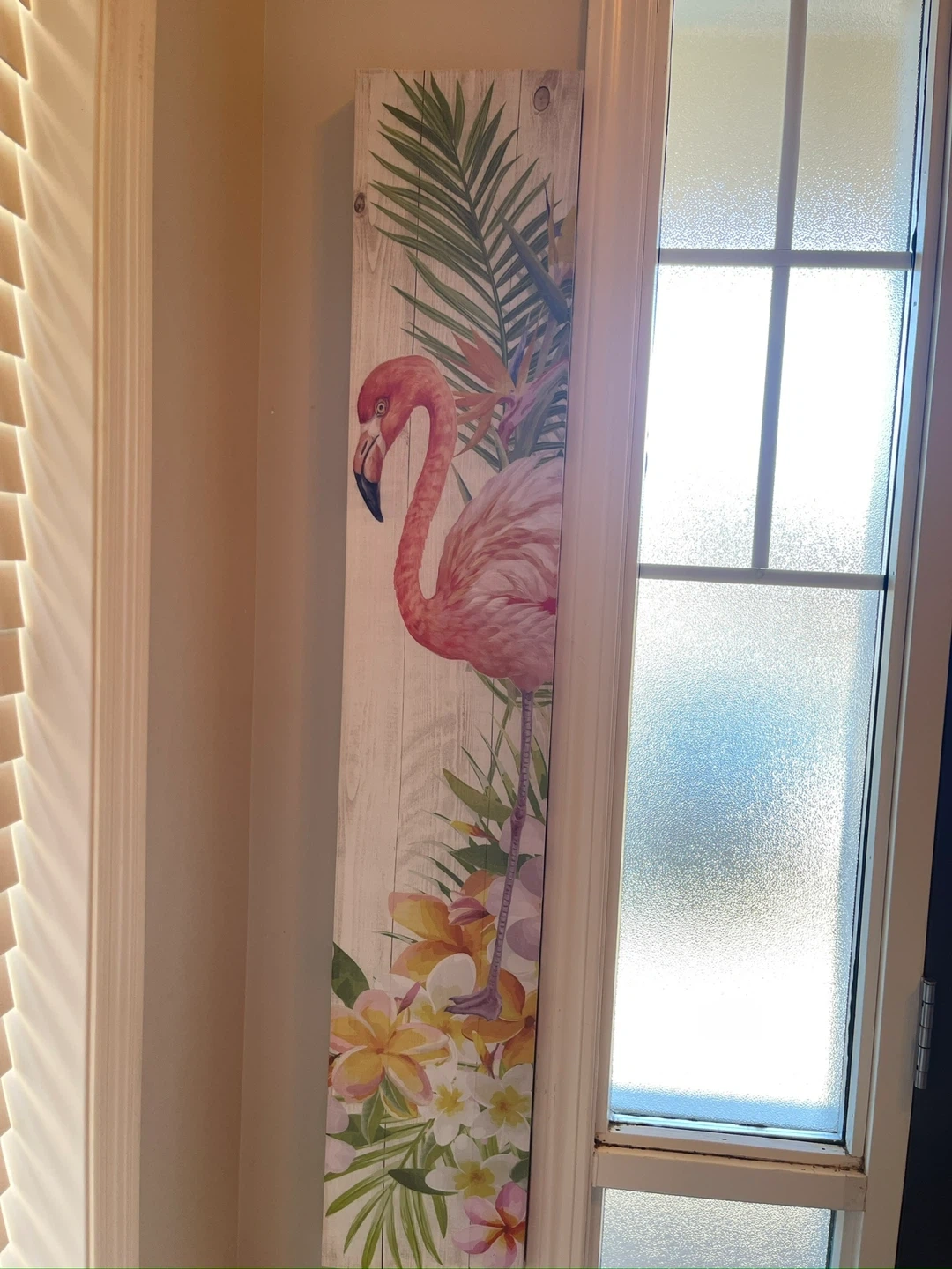A fun flamingo wall decor piece! It features a flamingo with tropical leaves and flowers on a white wood-look background. Perfect for adding a touch of the tropics to any room