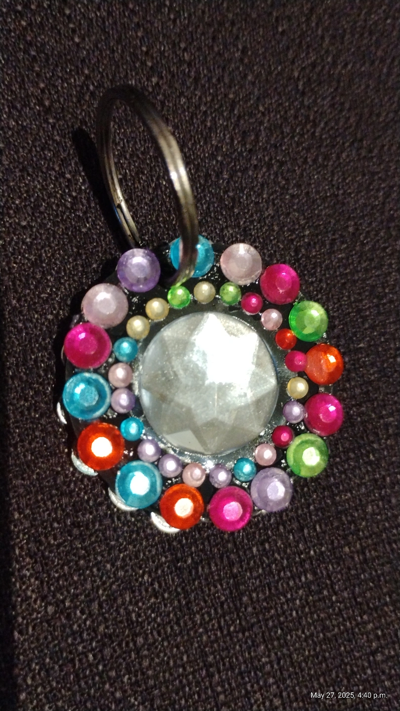 Features a large central rhinestone surrounded by smaller multicoloured rhinestones. Attached to a metal keyring.