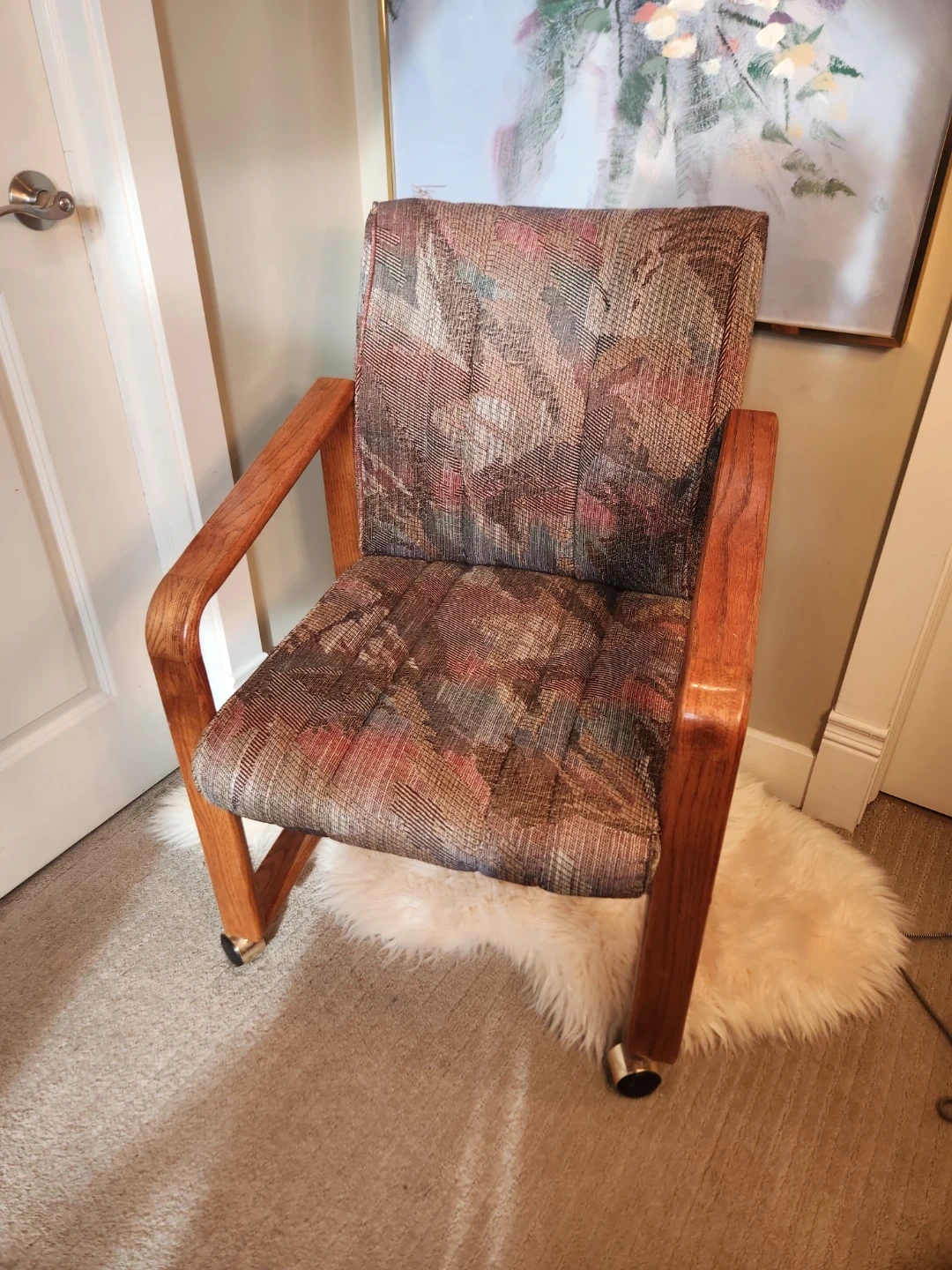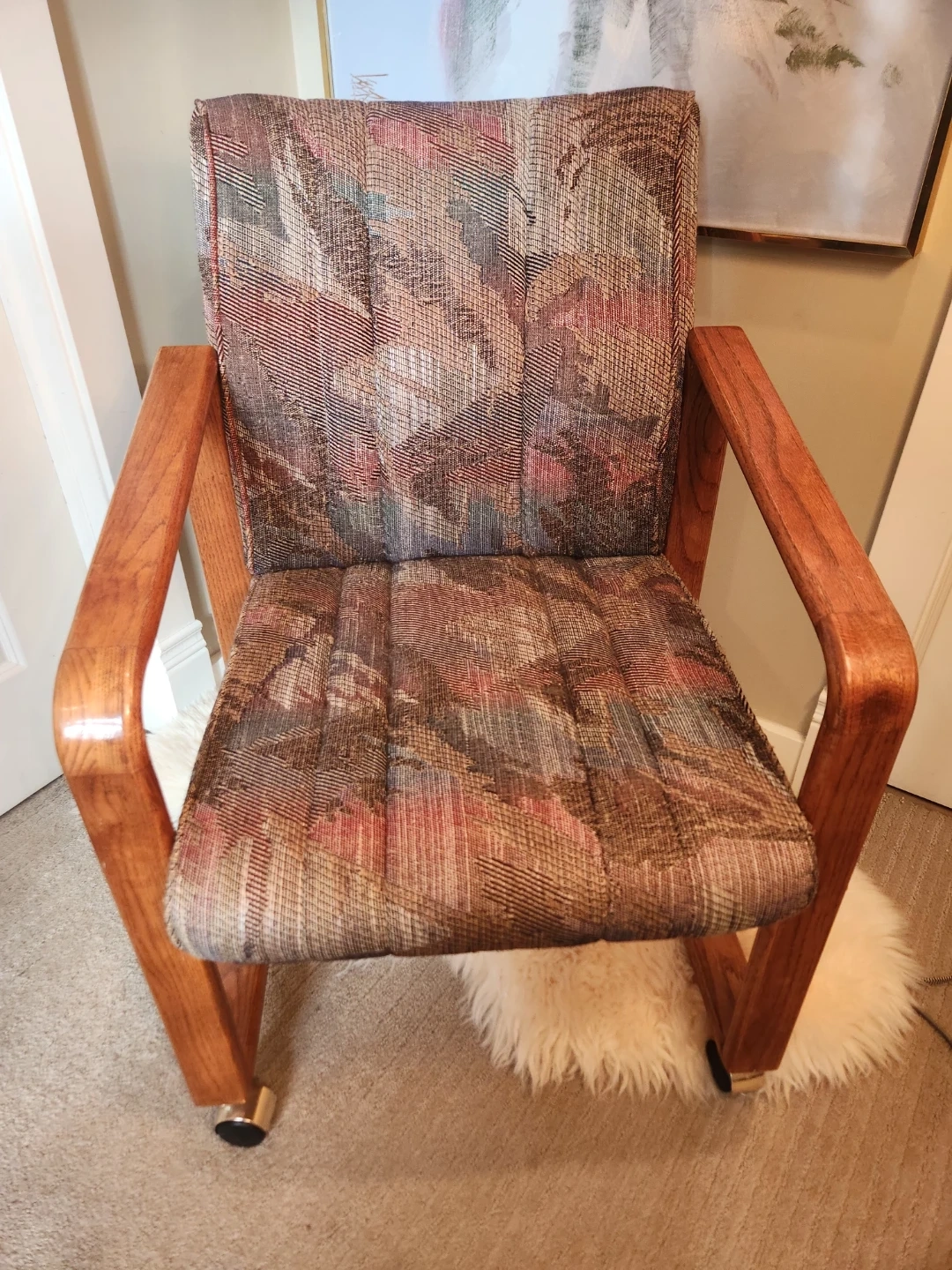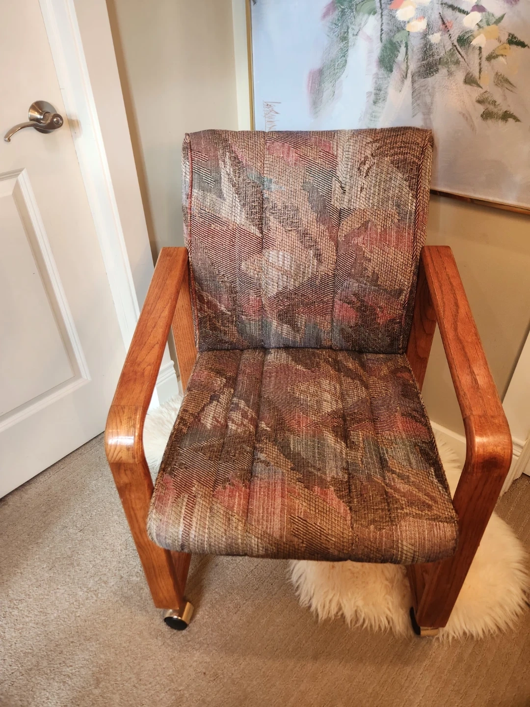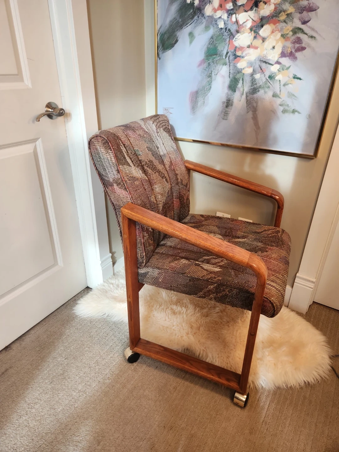 THERE are 2 CHAIRS available. So you can have chair races! Wheel around on this easy and very comfortable 80's armchair. Features a solid wood frame and upholstered seat and backrest with a multi-coloured patterned fabric. It's equipped with casters for easy mobility. Its compact design makes it suitable for smaller spaces, especially GREAT for holiday entertaining. 19x20 seat surface, arms are 24 inches across, top of chair back 34 inches high.