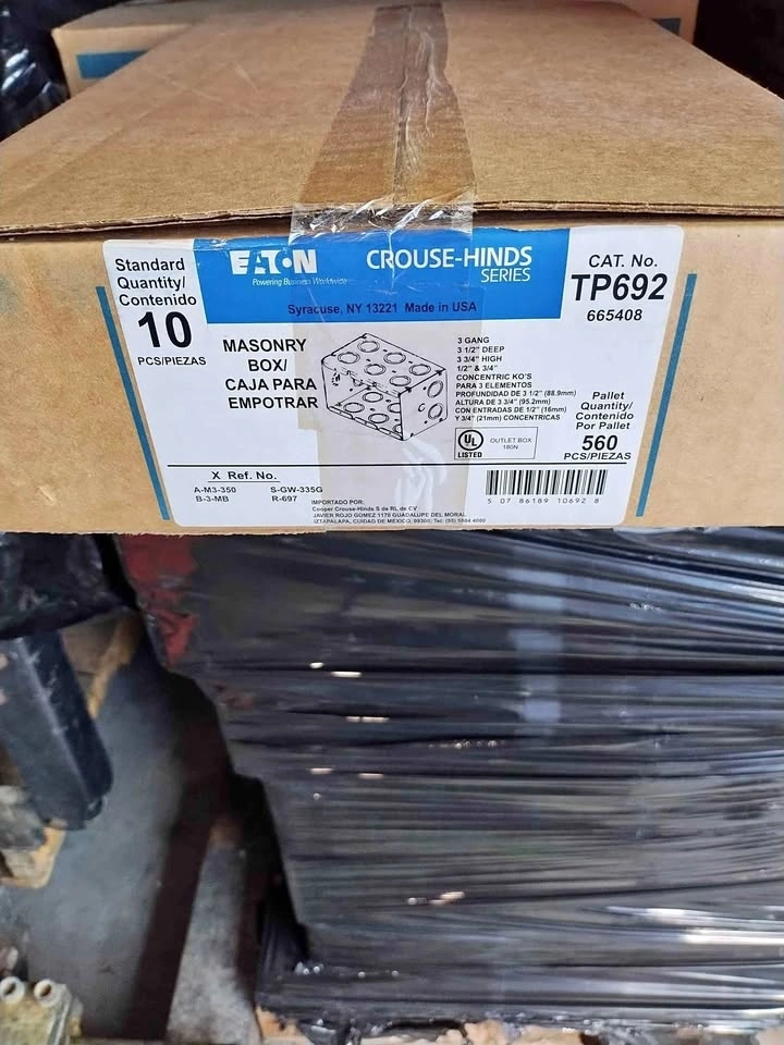 1 / 21 / 2Buy & SellMasonry BoxMasonry Box$75Box of 10 pcs - Eaton TP692/665408 3 Gang, 3-1/2" Deep, 3-3/4" High, Masonry Box. Pictures are of actual items you will receive.WHERE TO MEETCheck LocationView MapSELLERSimApplecroft100 reviews0 chats·0 favorites·1 viewsSEND CHAT TO SELLERHi Sim! I’m interested in your listing.Hi Sim! I’m interested in your listing.Get the Karrot app to chatSign In to chat