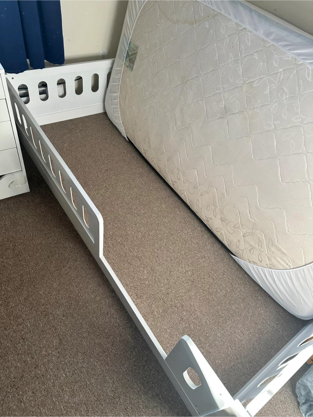 This white toddler bed features protective side rails. It's designed for a twin-sized mattress. Wood construction. Frame only!