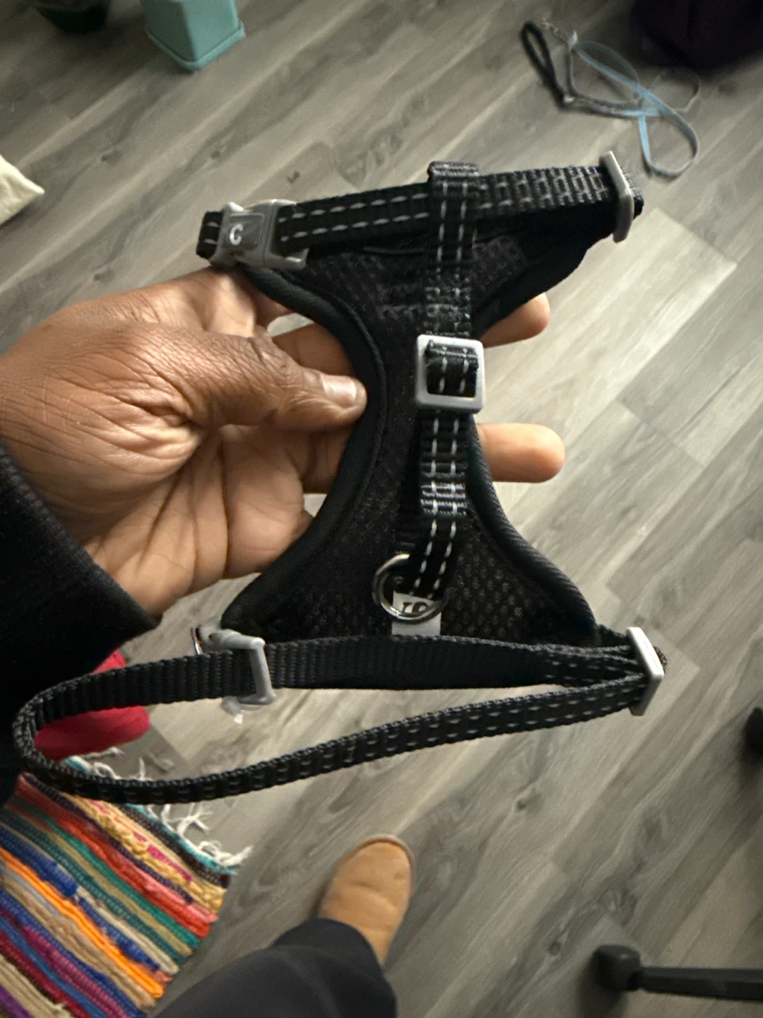 This black and leopard print kitten harness is size small. It features a breathable mesh material with adjustable straps for a comfortable fit. It's perfect for walks with your small indoor kitten!