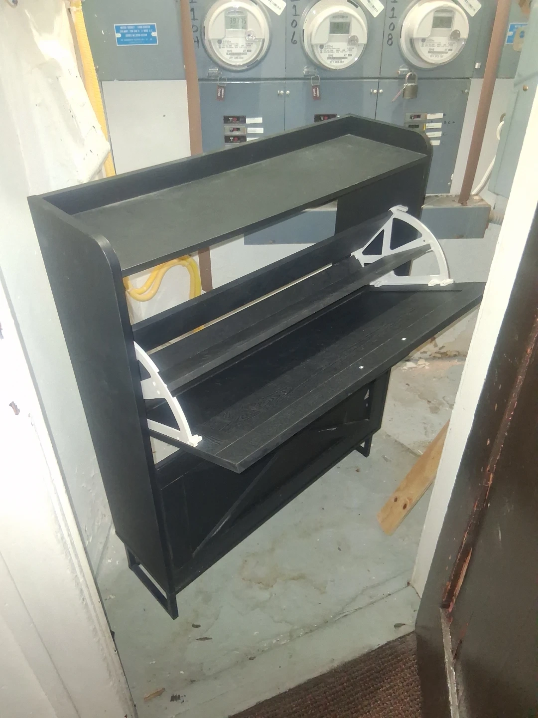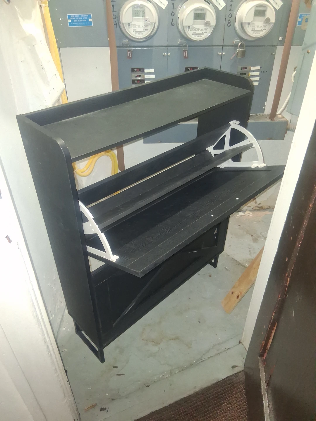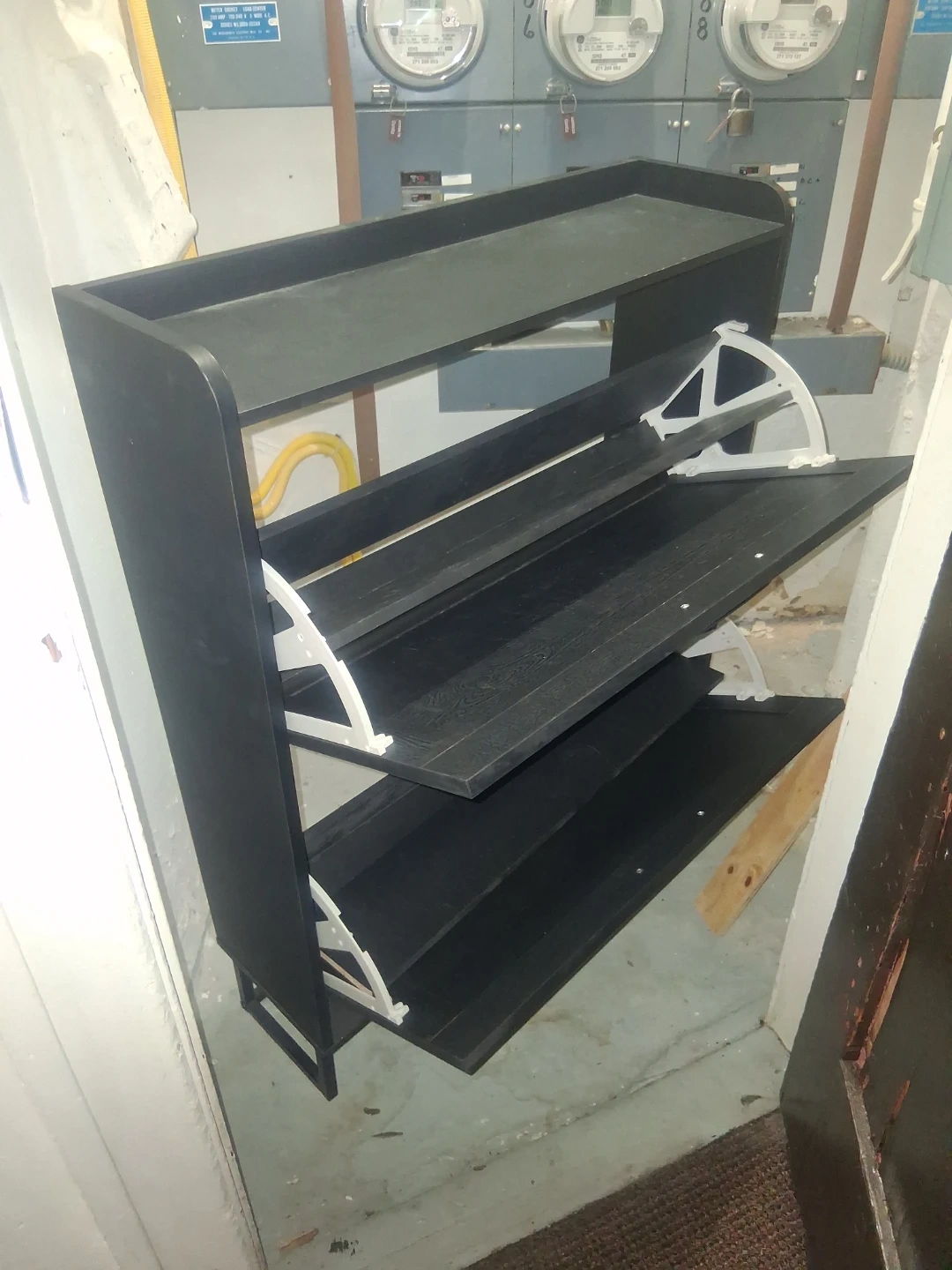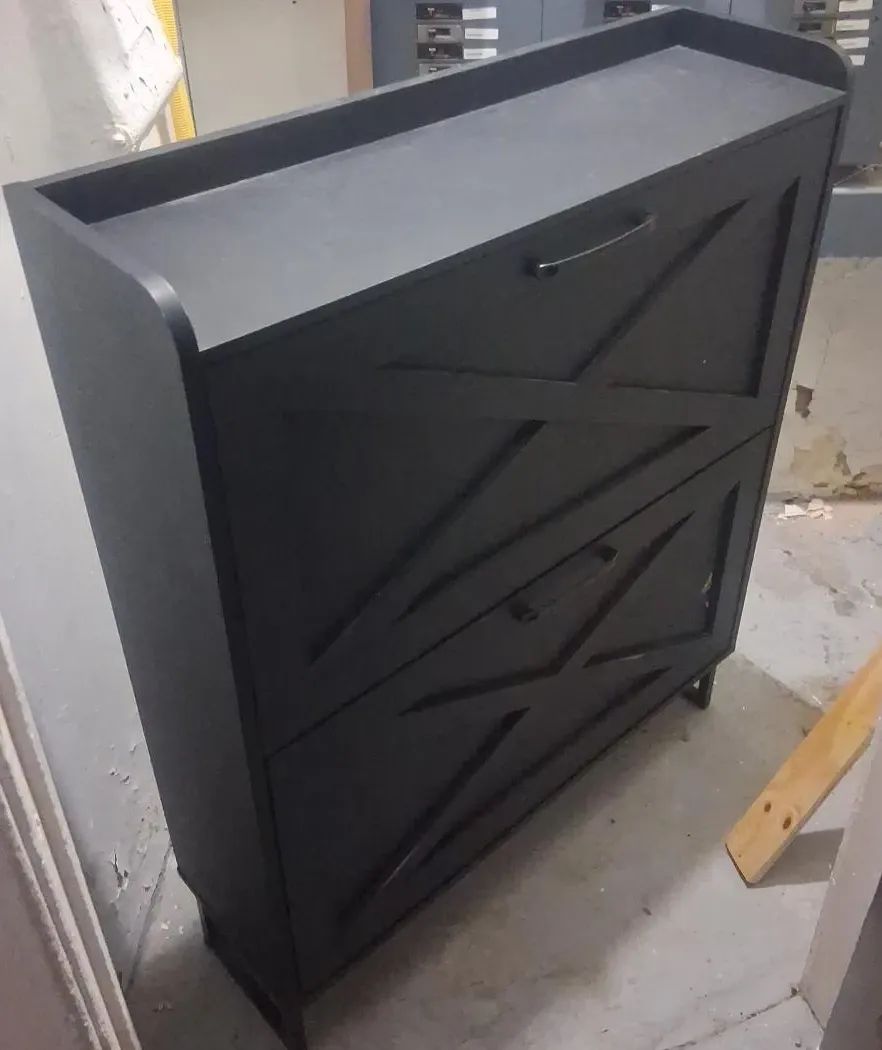 This black shoe rack has three tiers for storage. It's made of wood with a modern design. Perfect for organizing your footwear!