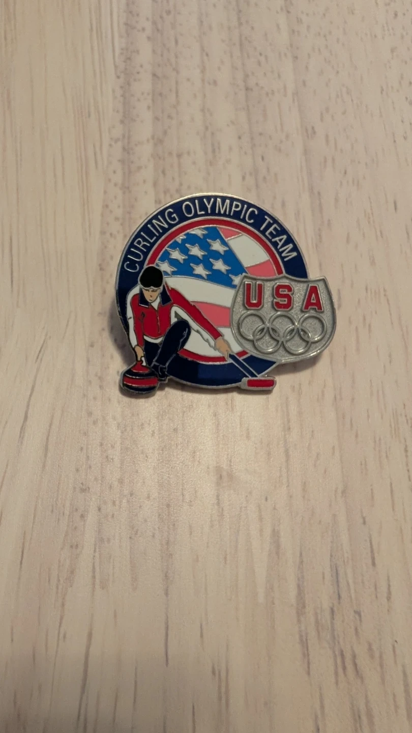 Show your support for the USA Curling Olympic Team with this enamel pin. It features a graphic of a curler in action and the Olympic rings. Made in China.