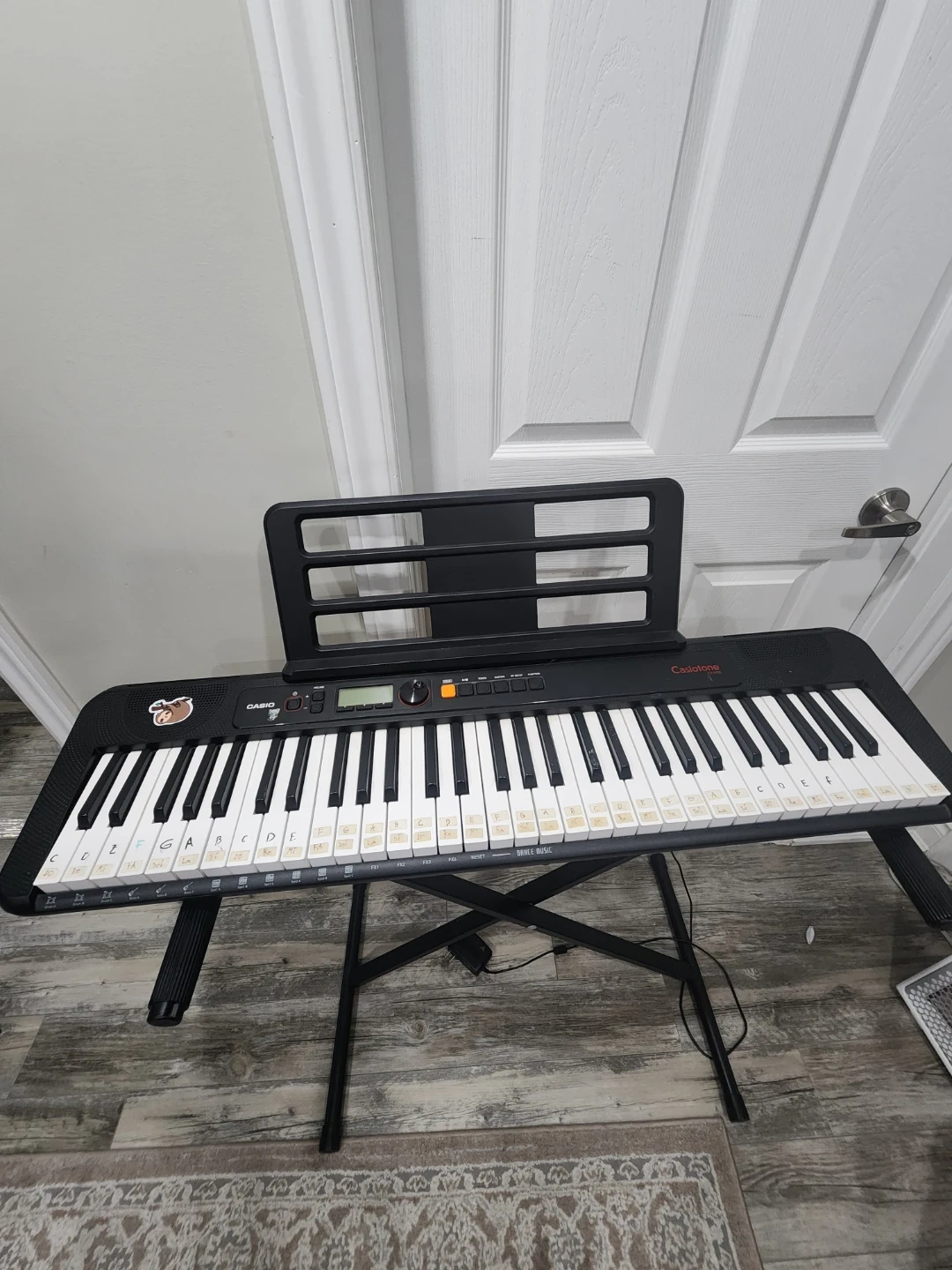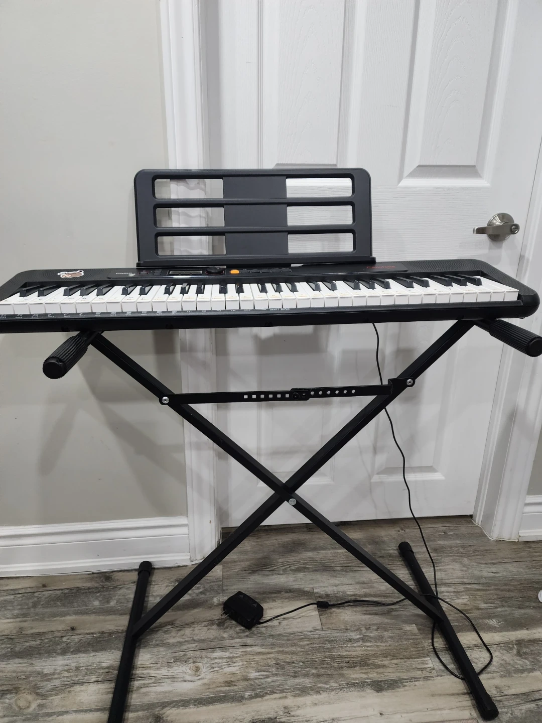 Casio Casiotone CT-S195 keyboard. Includes music stand and power adapter. Keys have stickers to help with learning. Great for beginners getting into music!