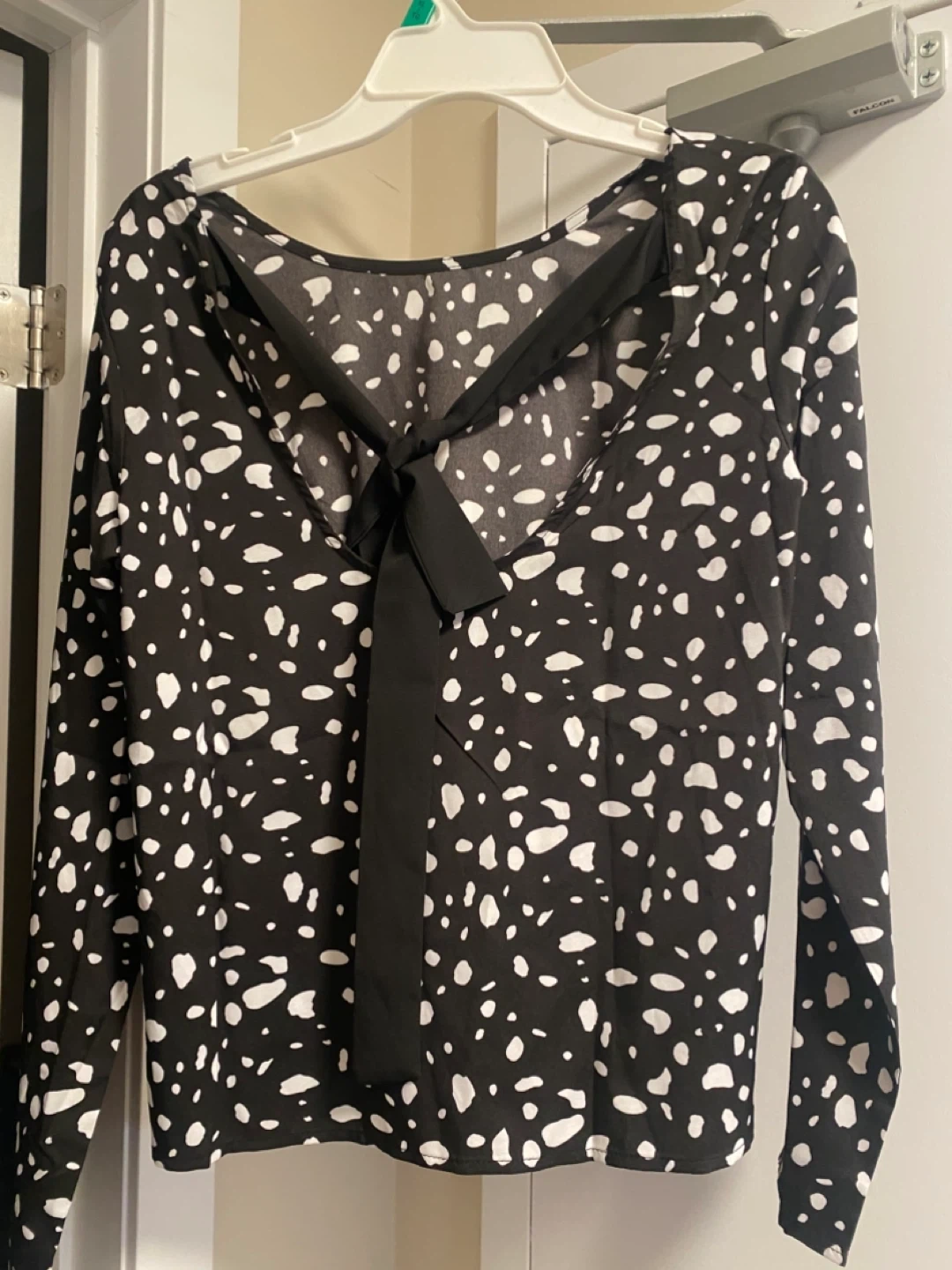Cute long sleeve top with a black and white speckled pattern. It features a V-neckline with a black tie detail at the back. This top's lightweight material makes it a comfy choice for everyday wear.