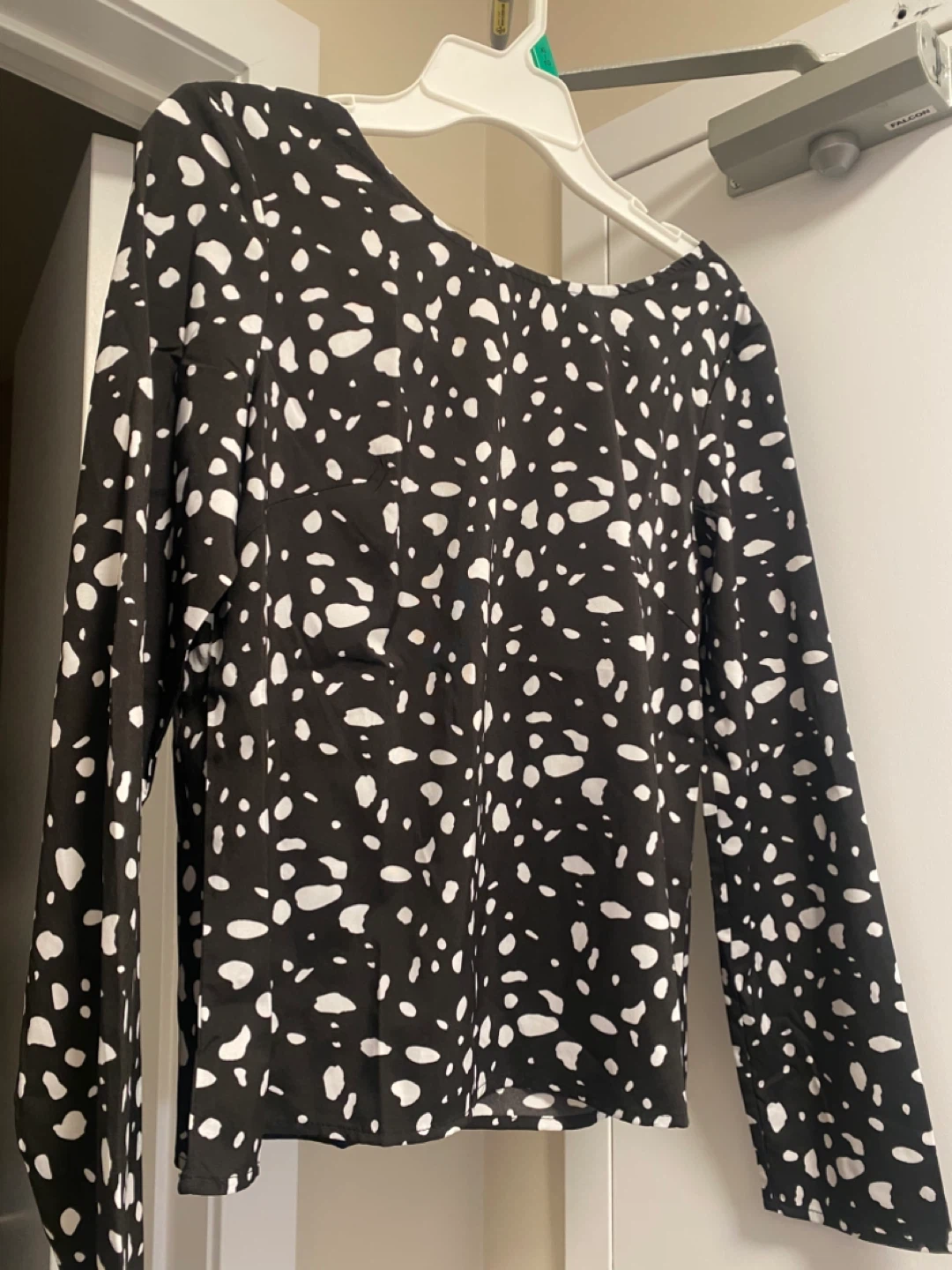 Cute long sleeve top with a black and white speckled pattern. It features a V-neckline with a black tie detail at the back. This top's lightweight material makes it a comfy choice for everyday wear.