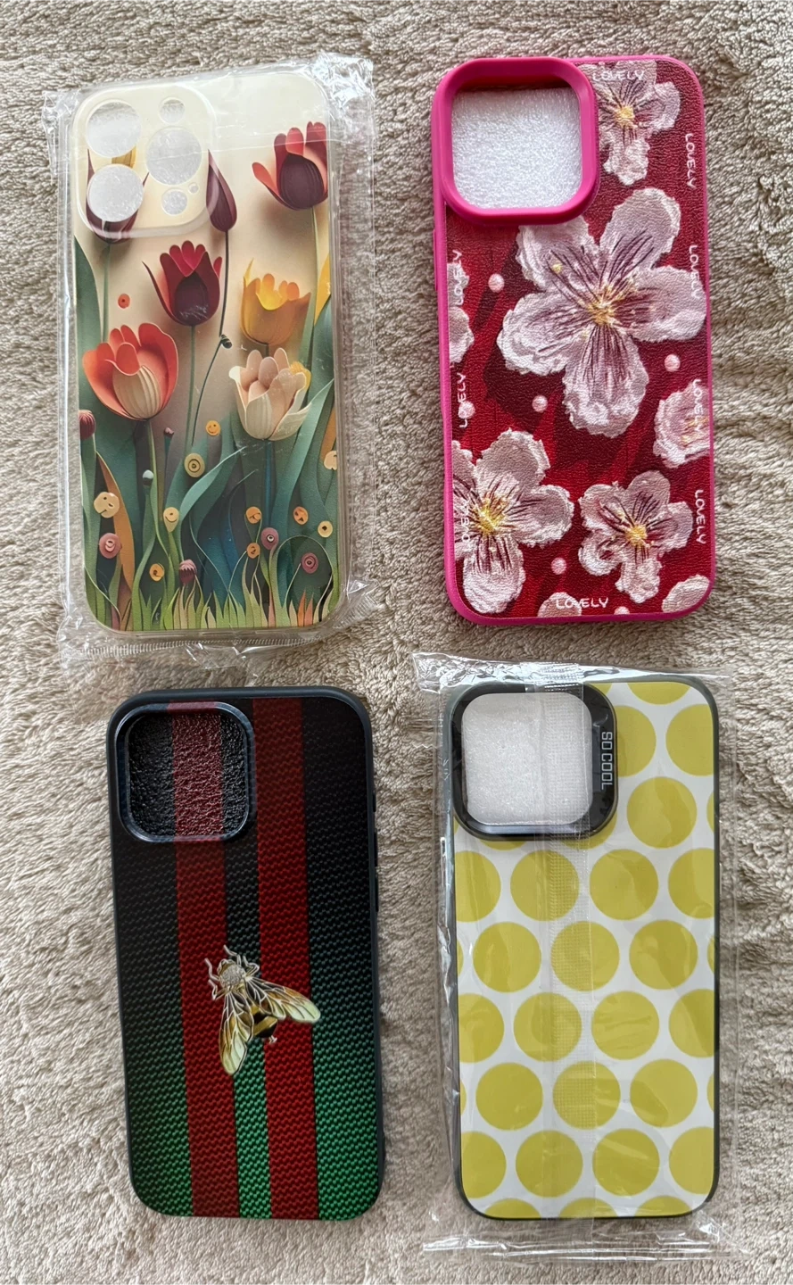 Variety of brand new iPhone Pro Max cases including floral, tulip, polka dot, and striped designs with a bee emblem. Also includes a clear case with MagSafe components and a tan silicone with different brands like LOVELY, SOCOOL and KEDOUSHI.