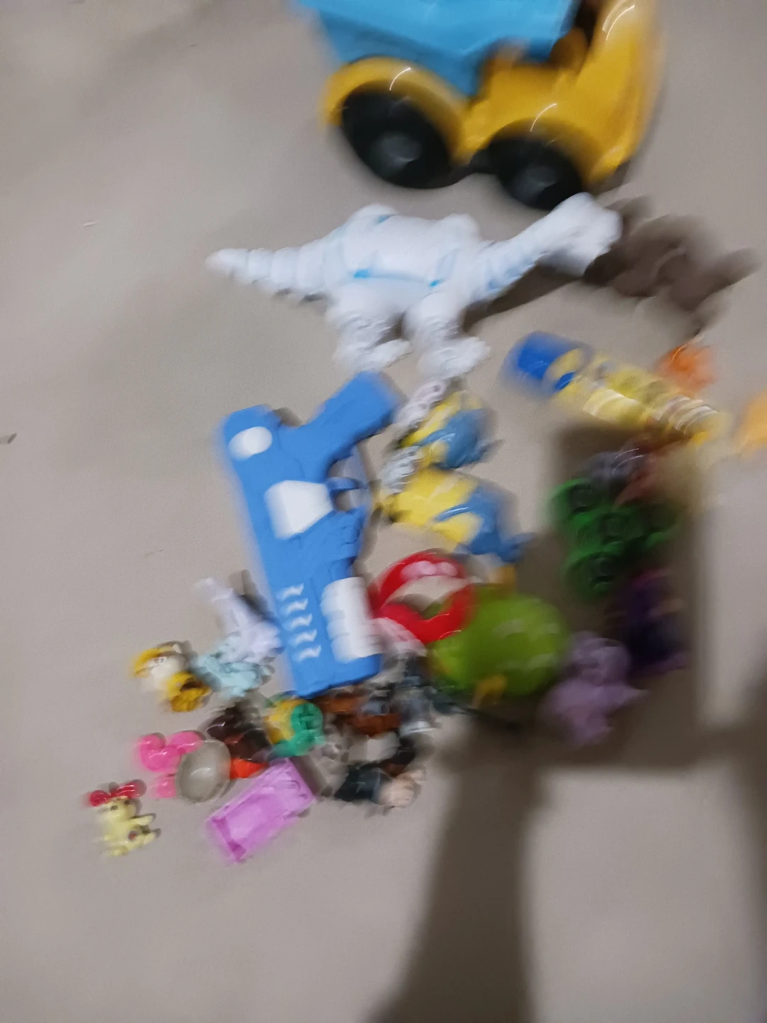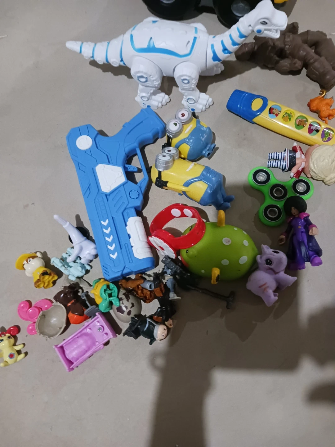 A collection of various kids' toys including a blue toy gun, a Minion toy, a dinosaur toy, and other small figures. These toys are great for imaginative play. Suitable for children who enjoy playing with action figures and vehicles.