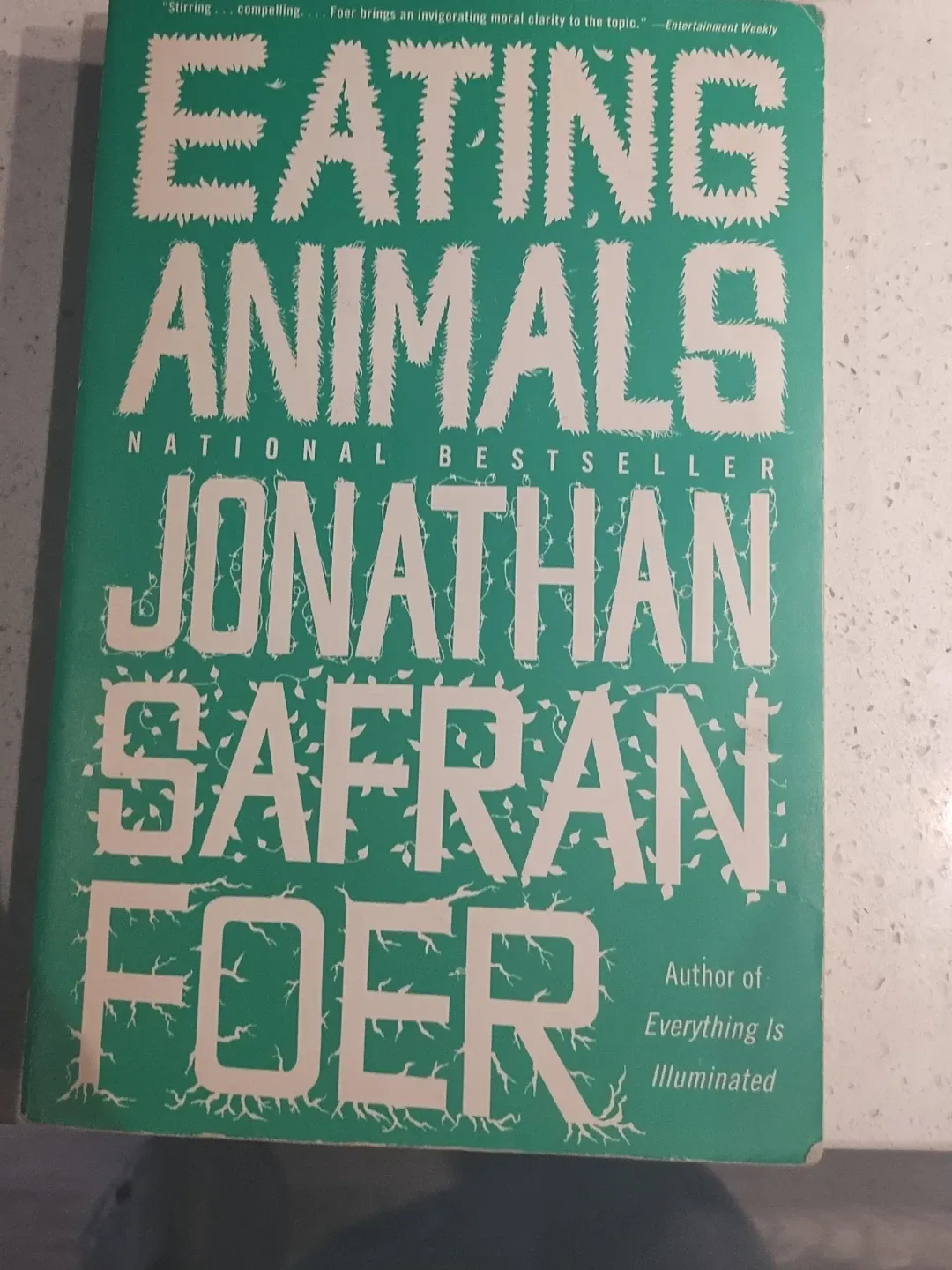 This is the National Bestseller "Eating Animals" by Jonathan Safran Foer. It explores the complex issues surrounding the consumption of meat. It's the author's examination of our relationship with food.