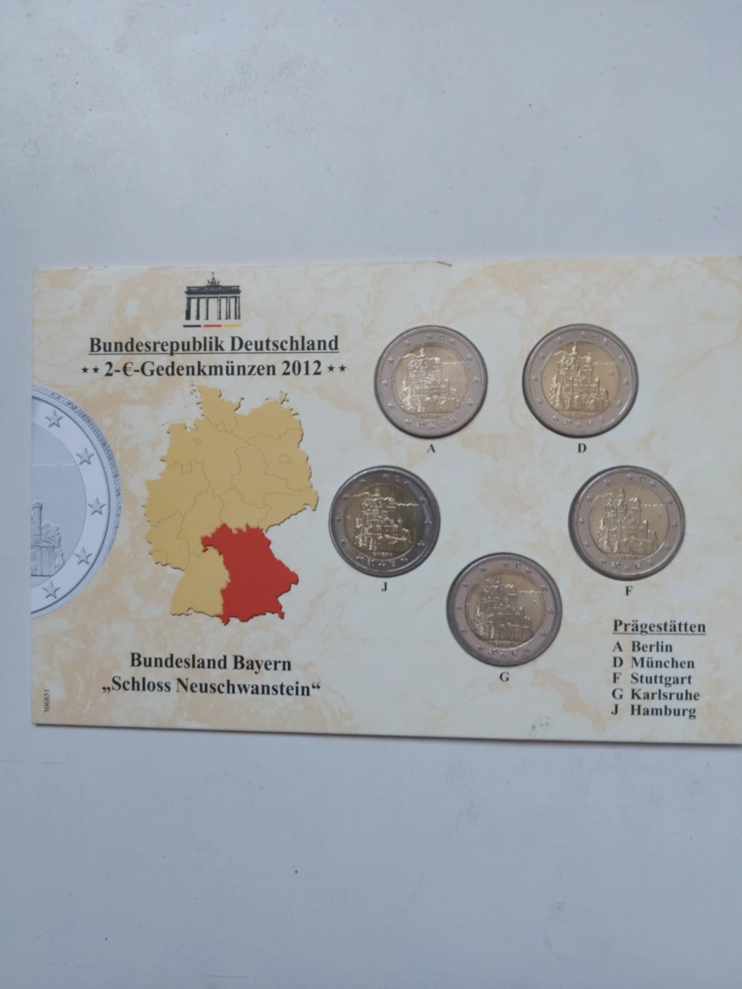 This set features four 2 Euro commemorative coins from Germany from 2012, highlighting Neuschwanstein Castle in Bavaria. Each coin has a diameter of 25.75 mm and a weight of 8.5 g. The coins are from the 'Bundesrepublik Deutschland 2-€-Gedenkmünzen 2012' series. They are presented in a card with images of the castle and map of Germany.