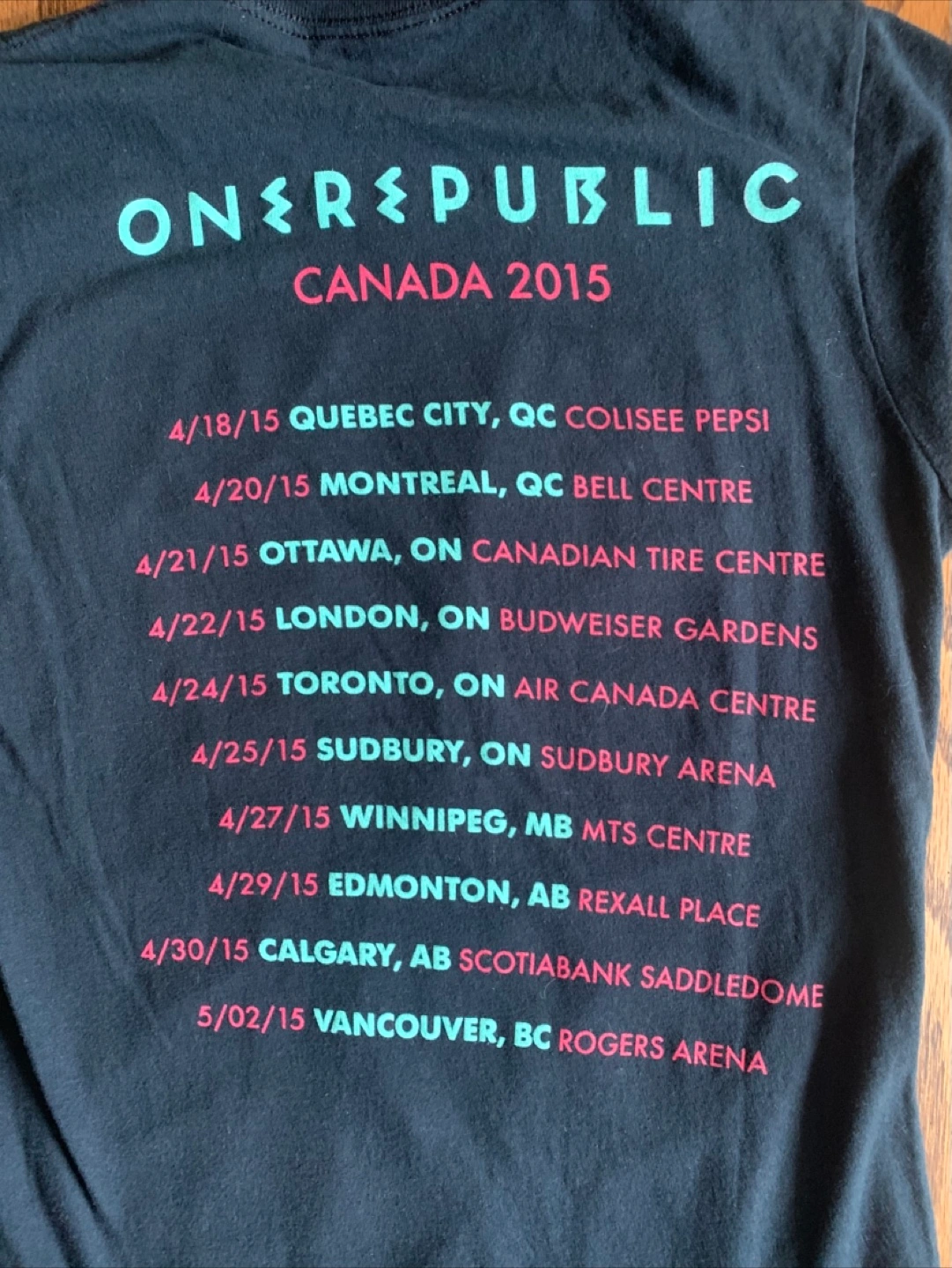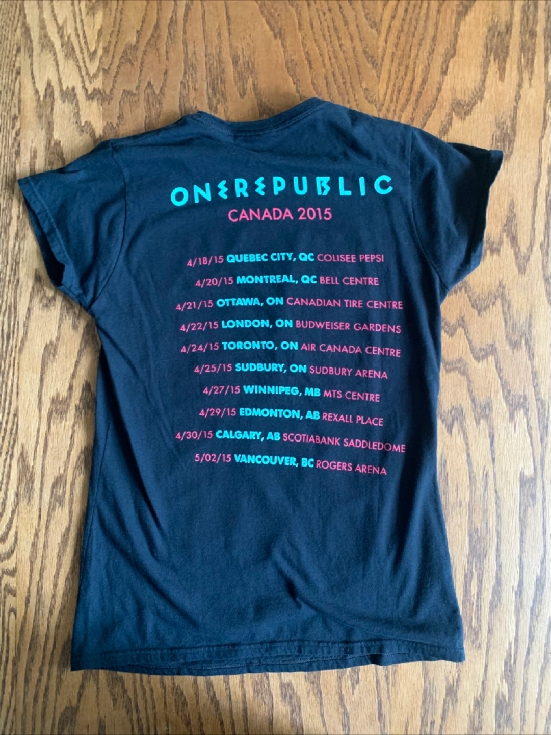 Selling a OneRepublic Canada 2015 tour t-shirt in size medium. It's made of 100% cotton and features the tour dates on the back. The front has a cool geometric design with the band's name. It's in great condition!