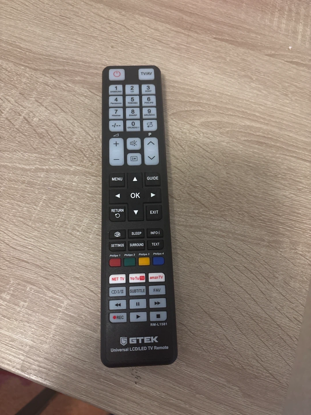 This is a GTEK universal remote, model RM-L1581. It's designed for LCD and LED TVs. Supports multiple brands like Samsung, LG, Sony, and more.