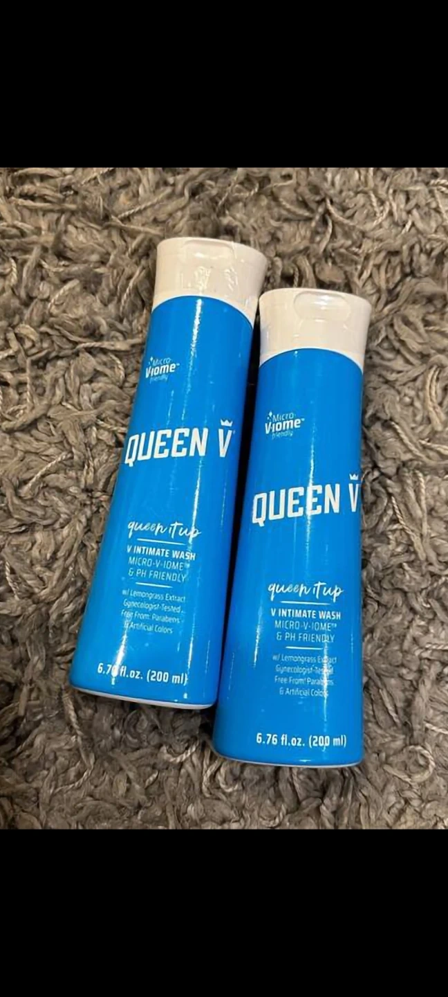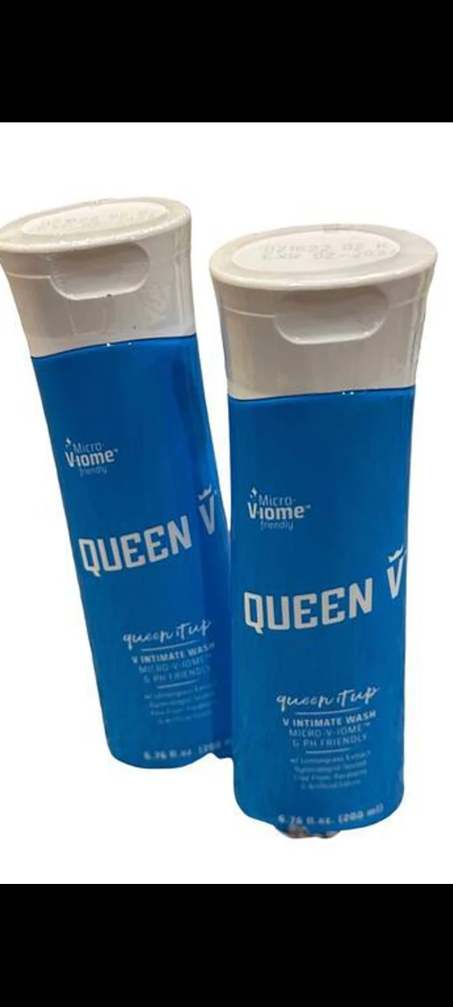 Two bottles of Queen V intimate wash. Each bottle is 6.76 fl. oz. (200 ml). It's formulated with lemongrass extract and is gynecologist-tested, pH-friendly. Free from parabens and artificial colors.
