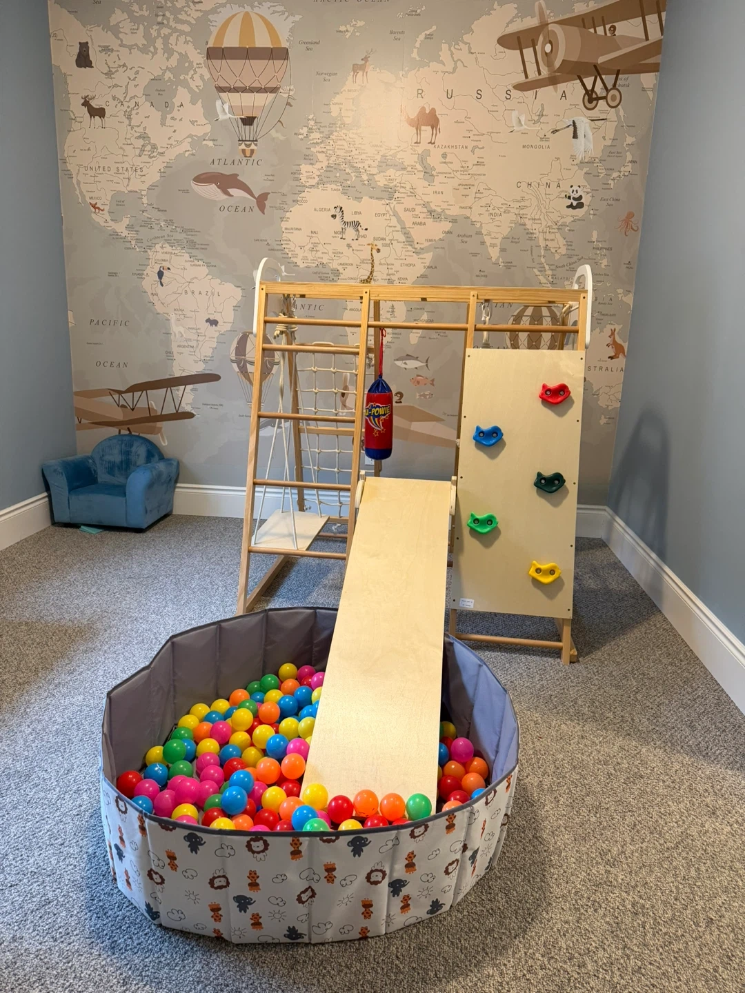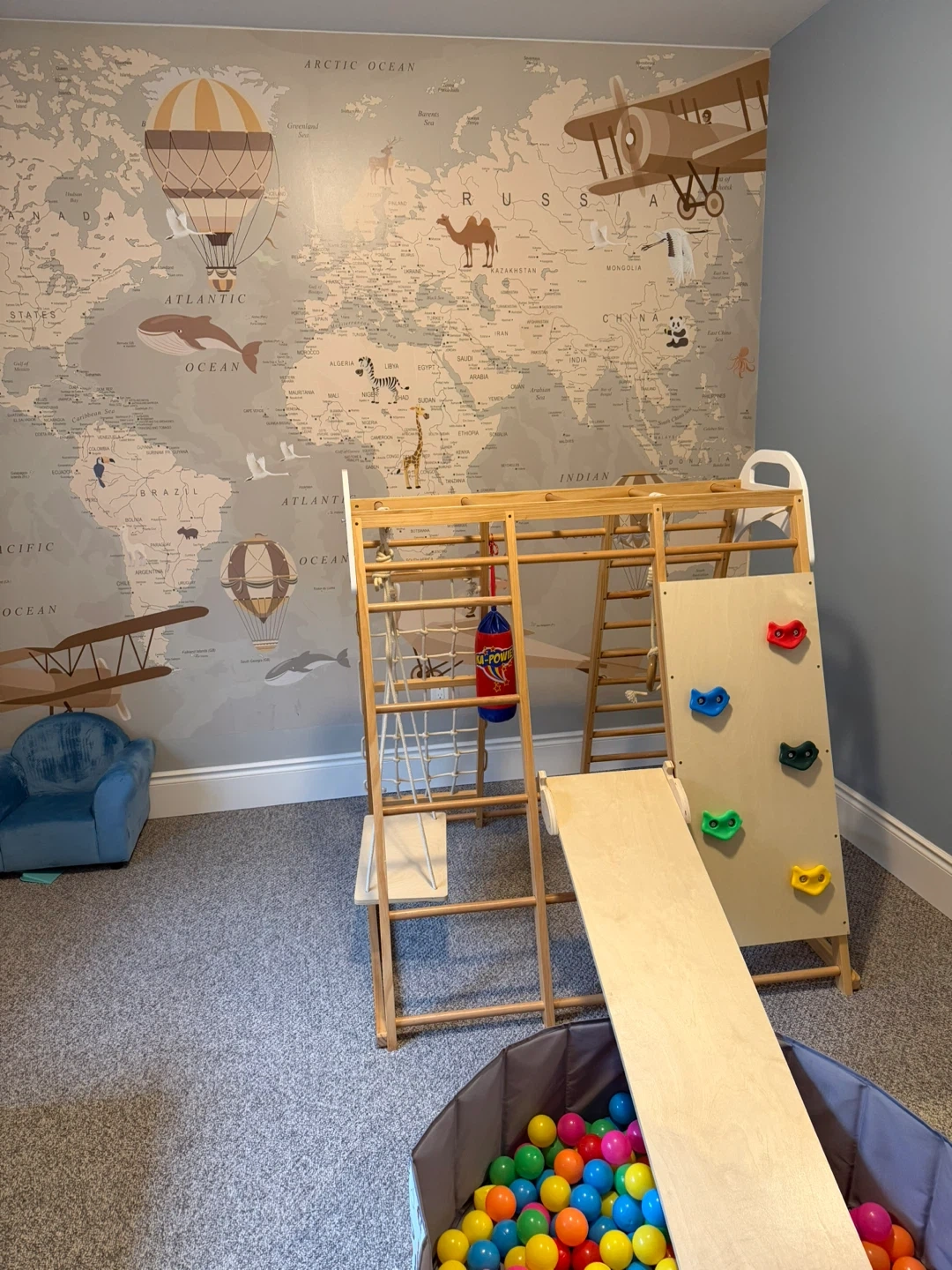 Super fun indoor climbing gym for kiddos. Wooden structure has slide, rock climbing wall, rope ladder, and swing. Comes with ball pit full of colorful balls. Great for keeping little ones active inside.