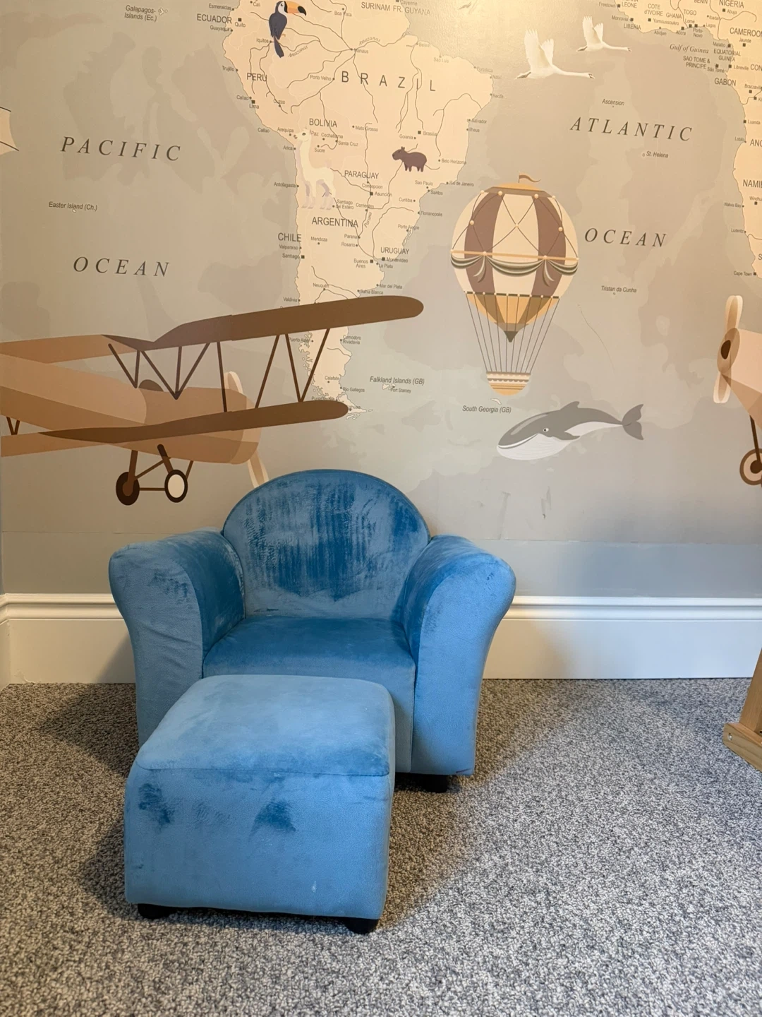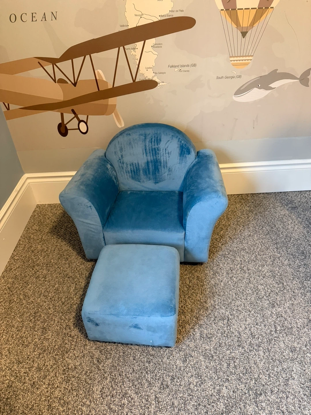 Small blue chair with food stool $75
