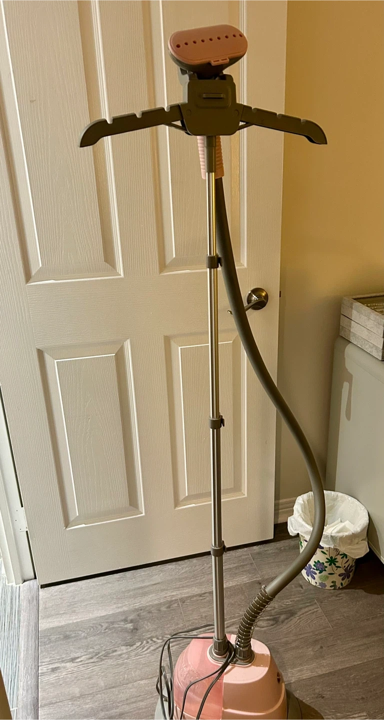 SALAV garment steamer in pink. It comes with a user manual and attachments. Included accessories: Pants Press Attachment, Fabric Brush.