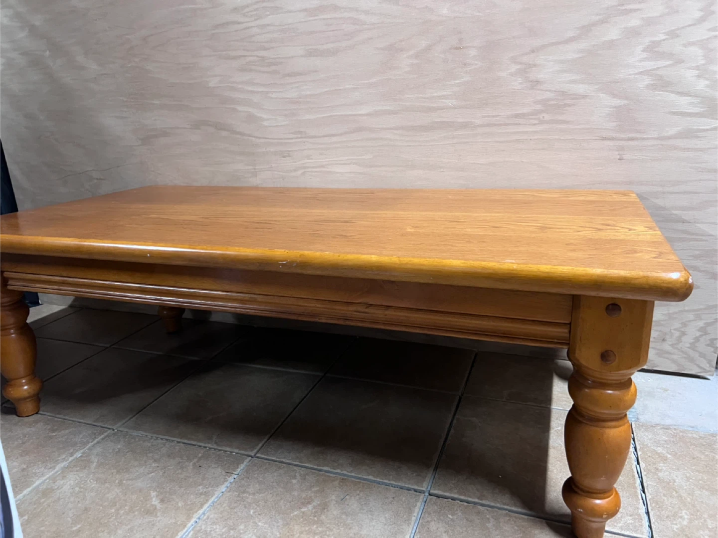 A classic solid oak coffee table with a warm, natural finish. It features turned legs for a touch of traditional style. This table's simple design makes it a versatile addition to any living space.