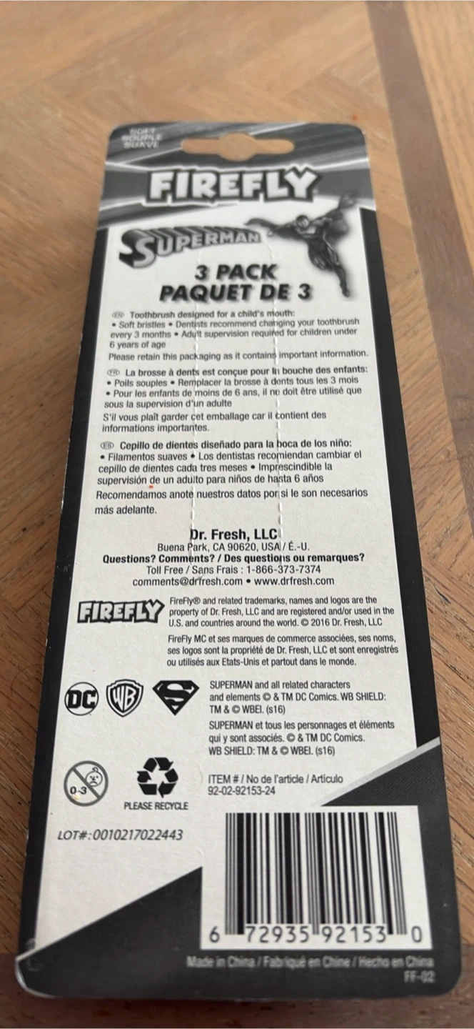 Here's a 3-pack of Firefly Superman toothbrushes! These are designed for a child's mouth and have soft bristles. It's recommended to replace your toothbrush every 3 months, Also available is a 3-pack of Batman toothbrushes!