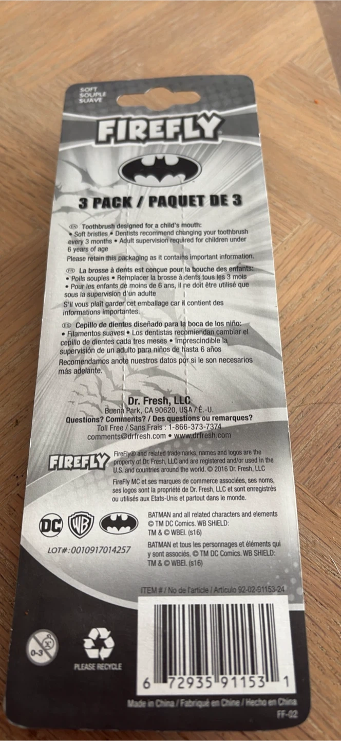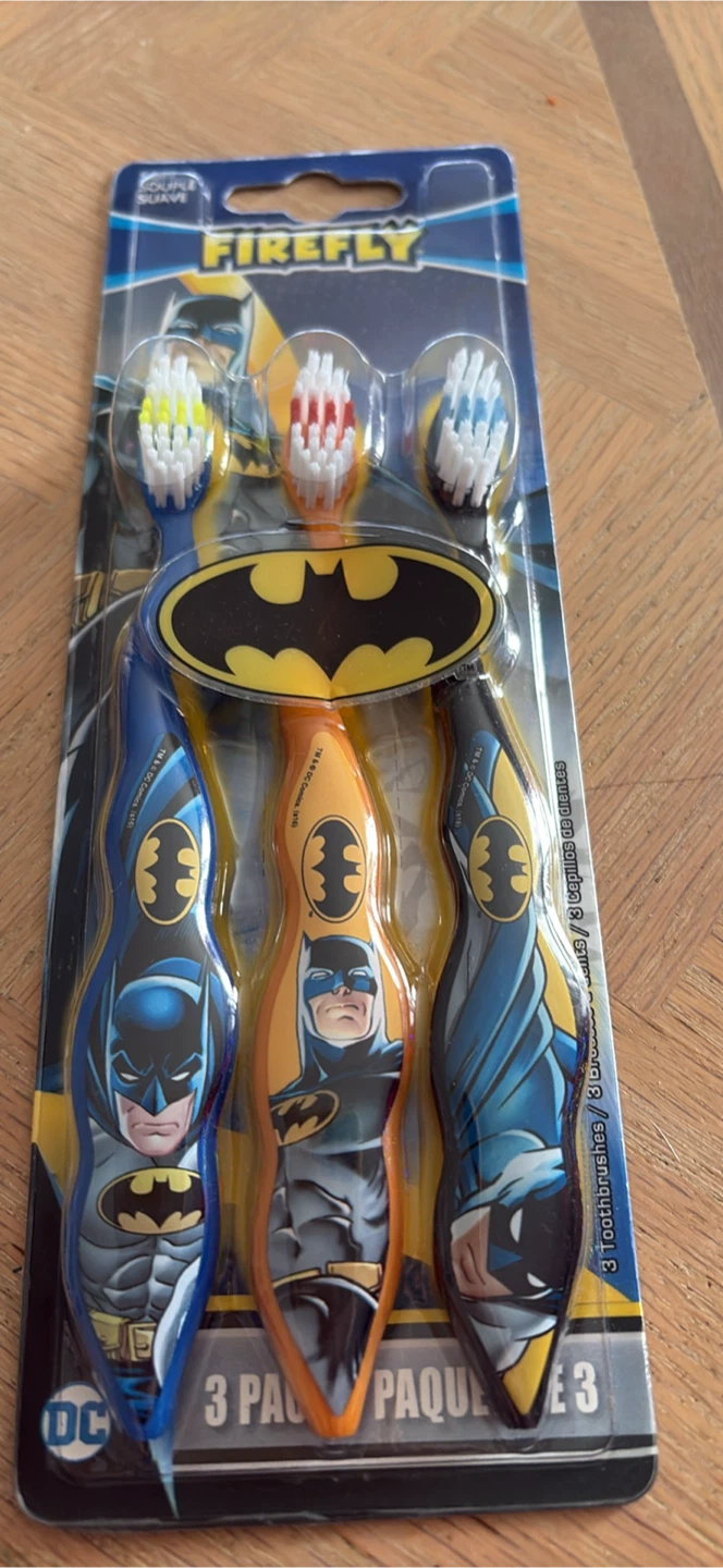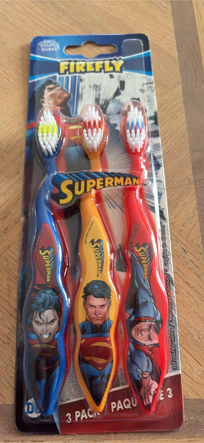Here's a 3-pack of Firefly Superman toothbrushes! These are designed for a child's mouth and have soft bristles. It's recommended to replace your toothbrush every 3 months, Also available is a 3-pack of Batman toothbrushes!