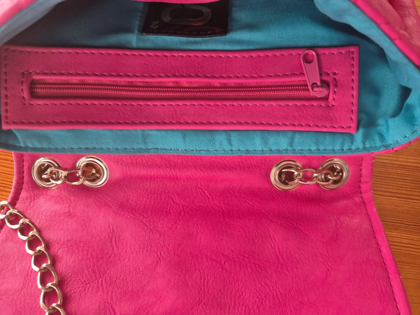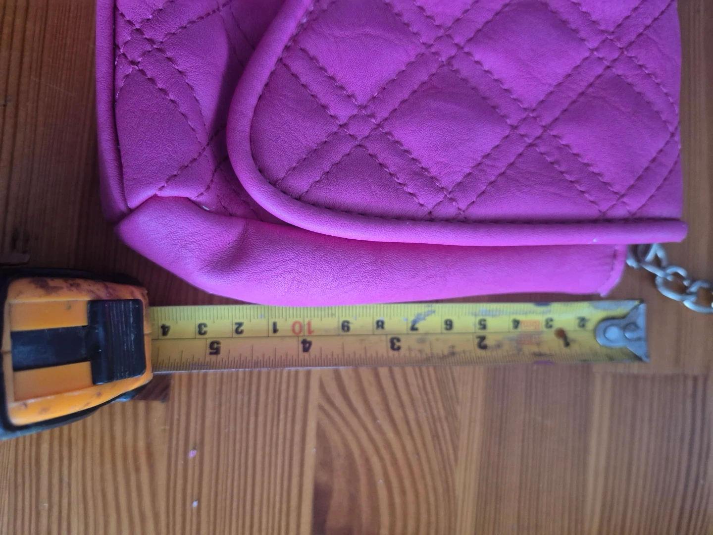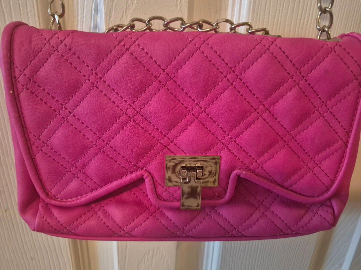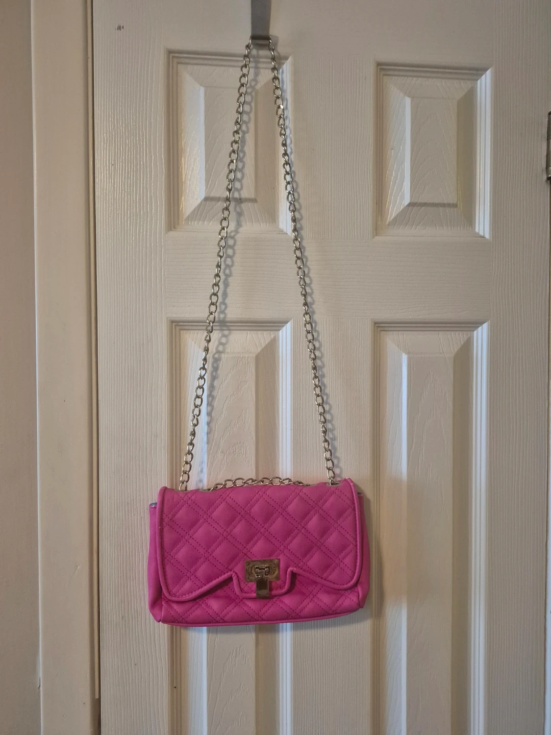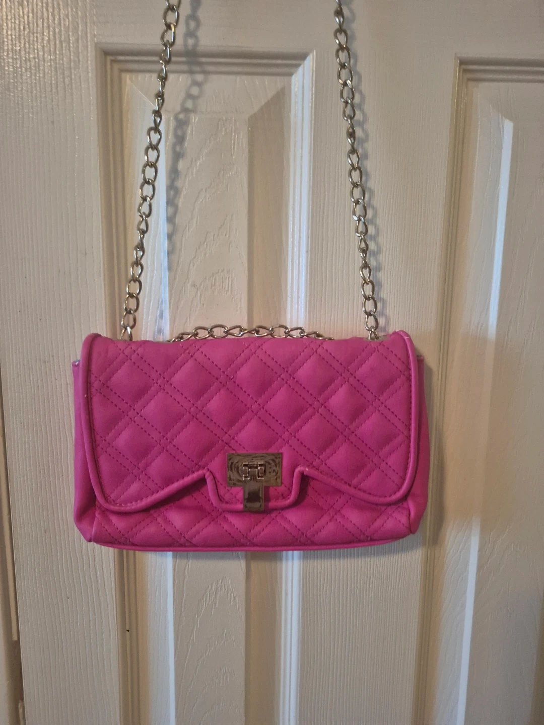 A cute quilted shoulder bag in a bright hot pink colour. It's got a stylish metal clasp closure and a silver chain strap. Inside, there's a zippered pocket for small essentials.