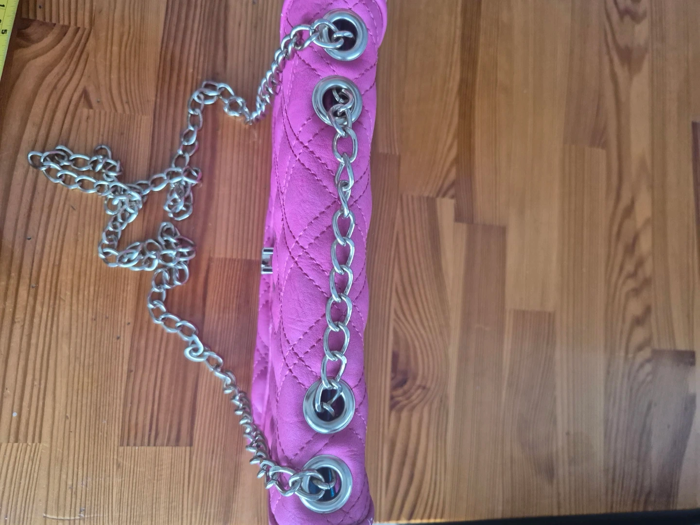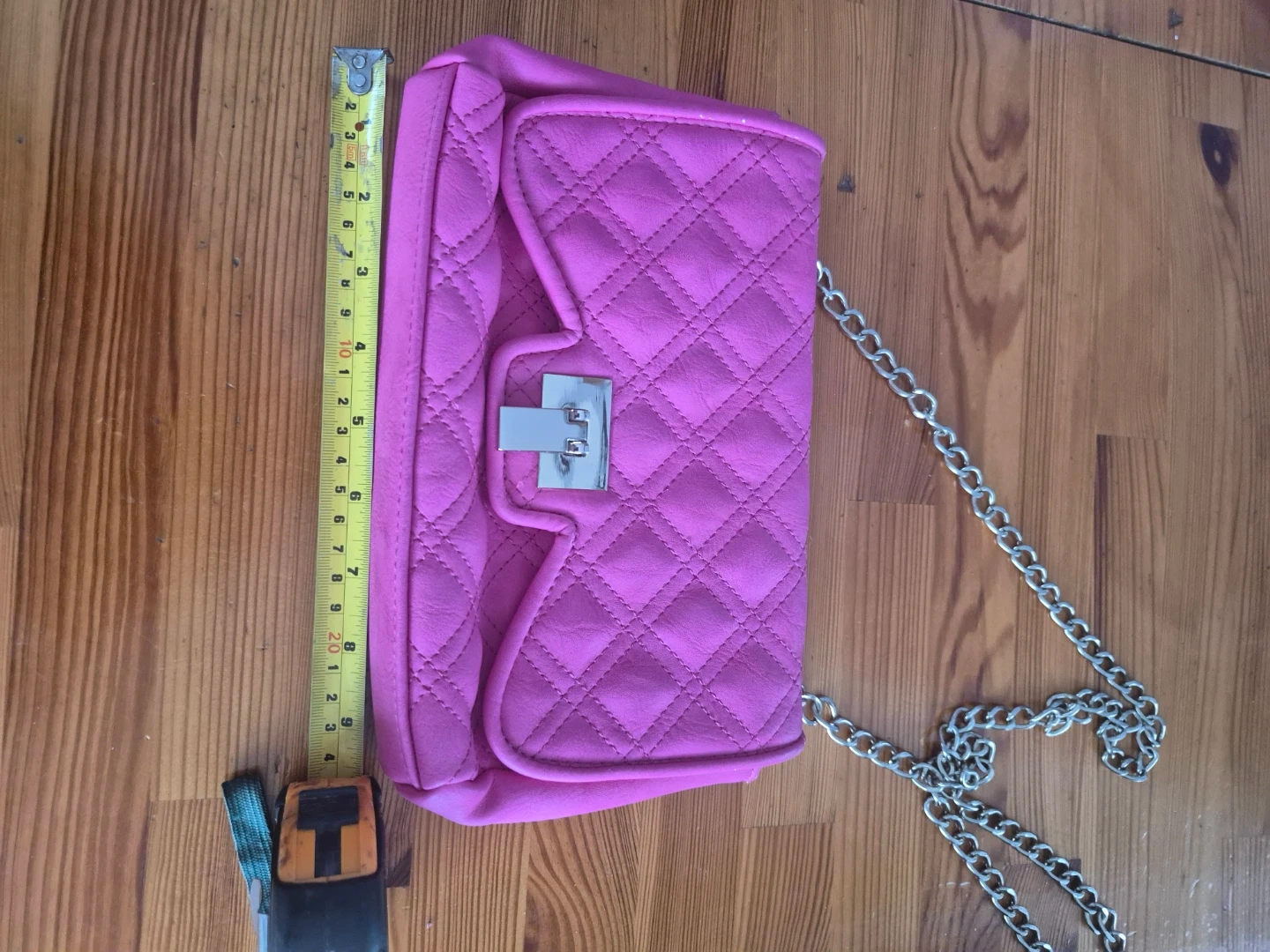A cute quilted shoulder bag in a bright hot pink colour. It's got a stylish metal clasp closure and a silver chain strap. Inside, there's a zippered pocket for small essentials.