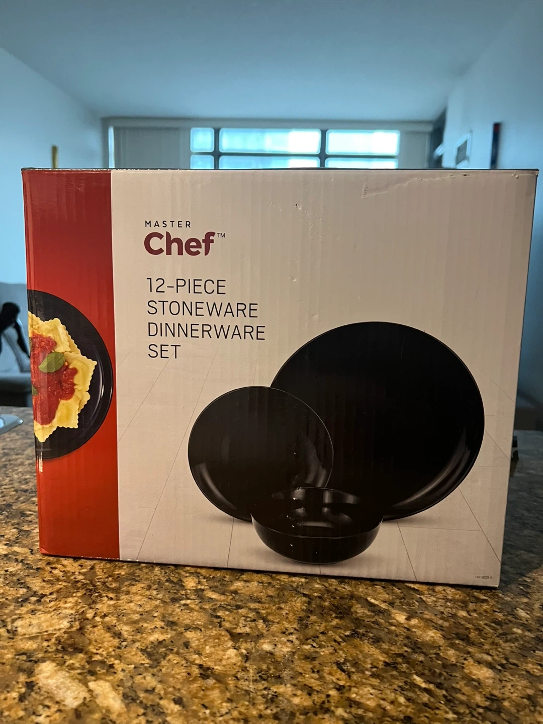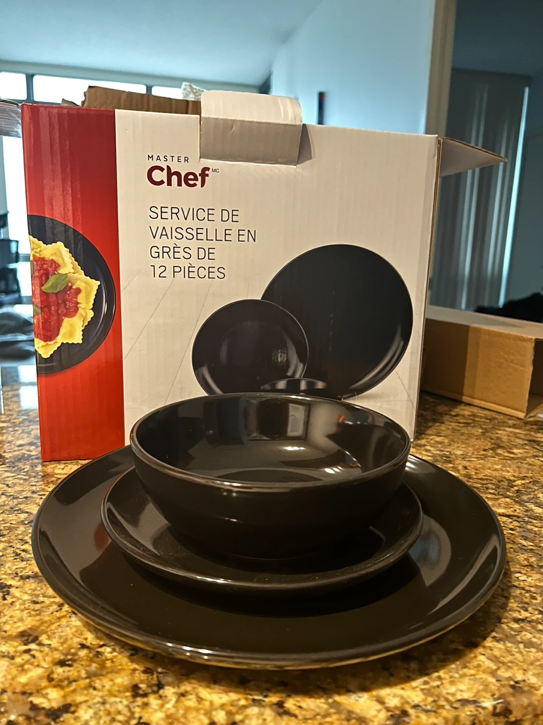 This is a 12-piece stoneware dinnerware set from Master Chef. It includes 4 dinner plates, 4 salad plates and 4 bowls in a sleek black finish. The set is made of durable stoneware.