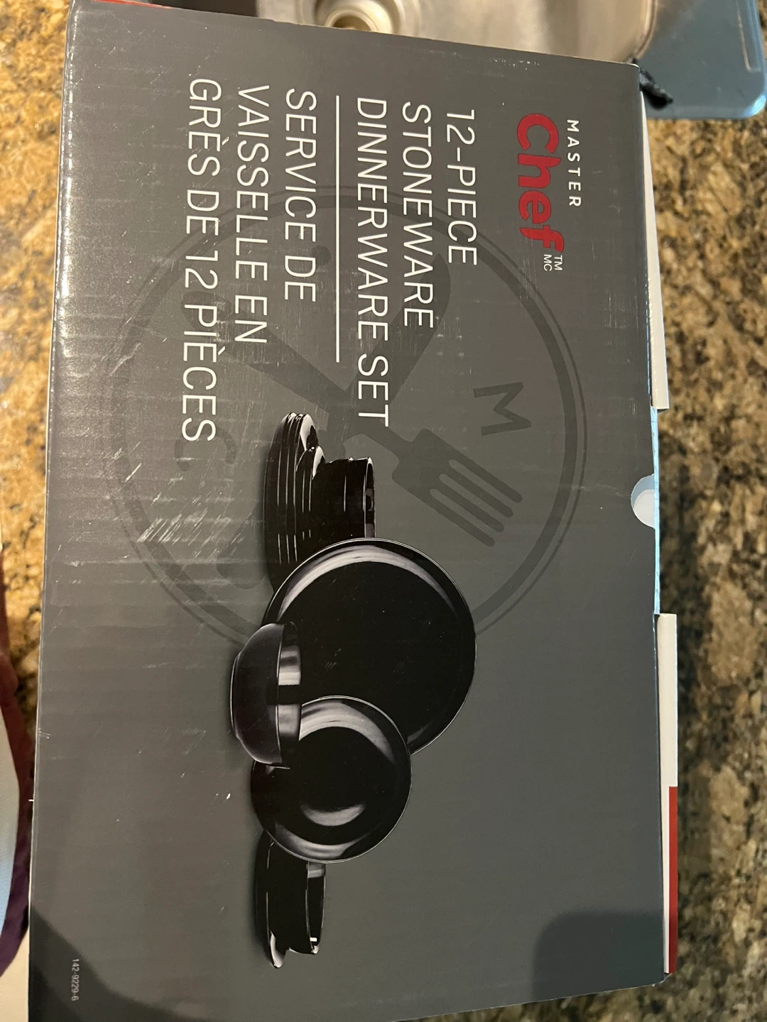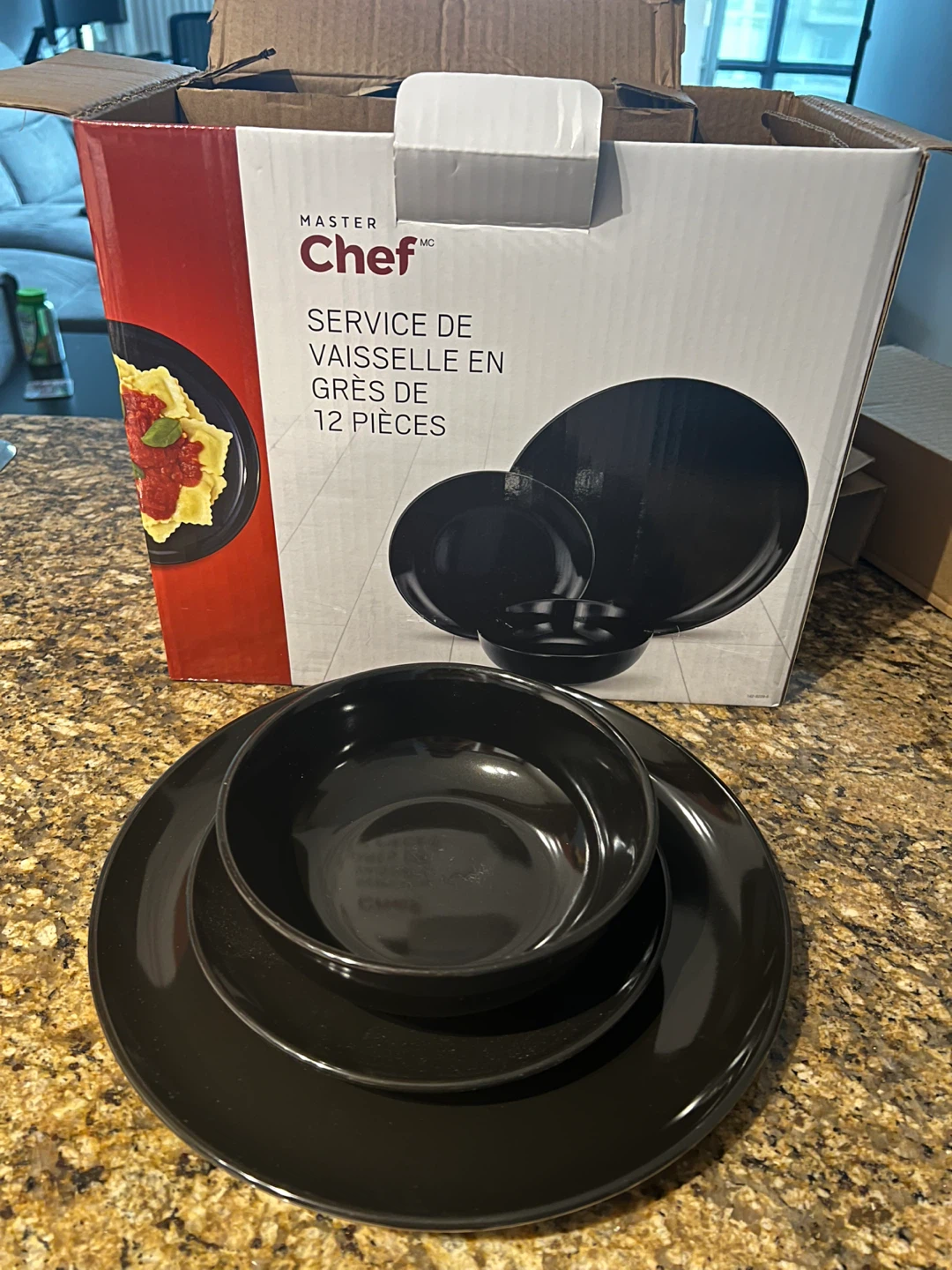 This is a 12-piece stoneware dinnerware set from Master Chef. It includes 4 dinner plates, 4 salad plates and 4 bowls in a sleek black finish. The set is made of durable stoneware.