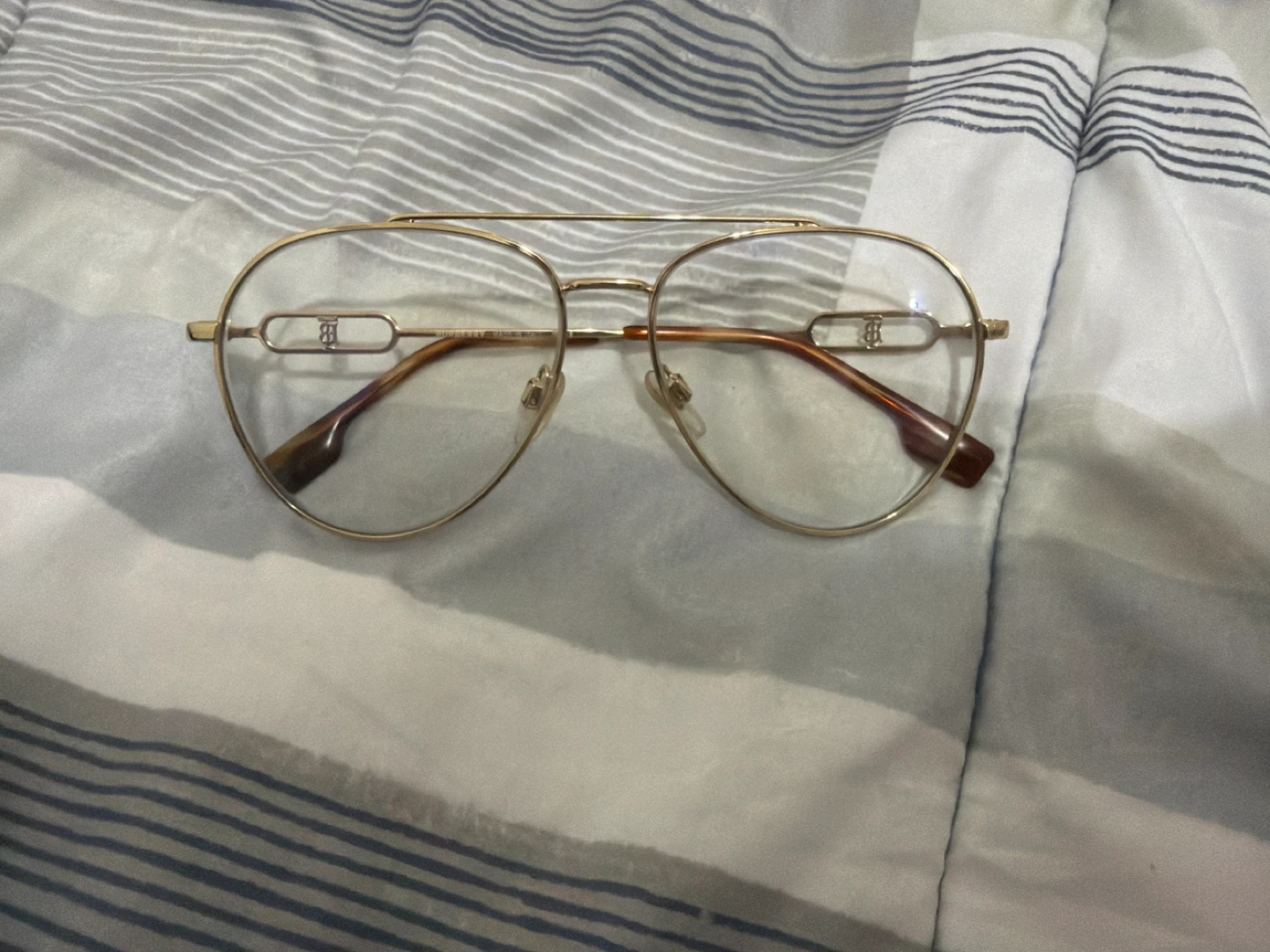 These are Burberry eyeglasses frames in a classic aviator style. They feature a gold-tone metal frame with subtle branding on the temples. The lenses are clear and appear to be for display or prescription fitting.