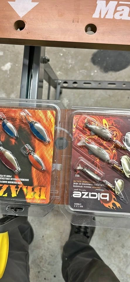 New Blaze fishing gear sets. Includes one 4-piece premium gamefish spoon set and one 3-piece premium minnow spinner set in sizes 1, 2, and 3. Lures have silver, blue, and orange finishes with metal construction.