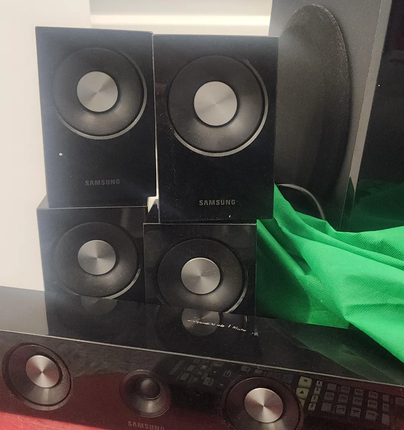 A set of 5 Samsung surround sound speakers with a subwoofer. They're black and made of plastic. These speakers would be great for enhancing your home theatre experience! Works well, its a wired system.