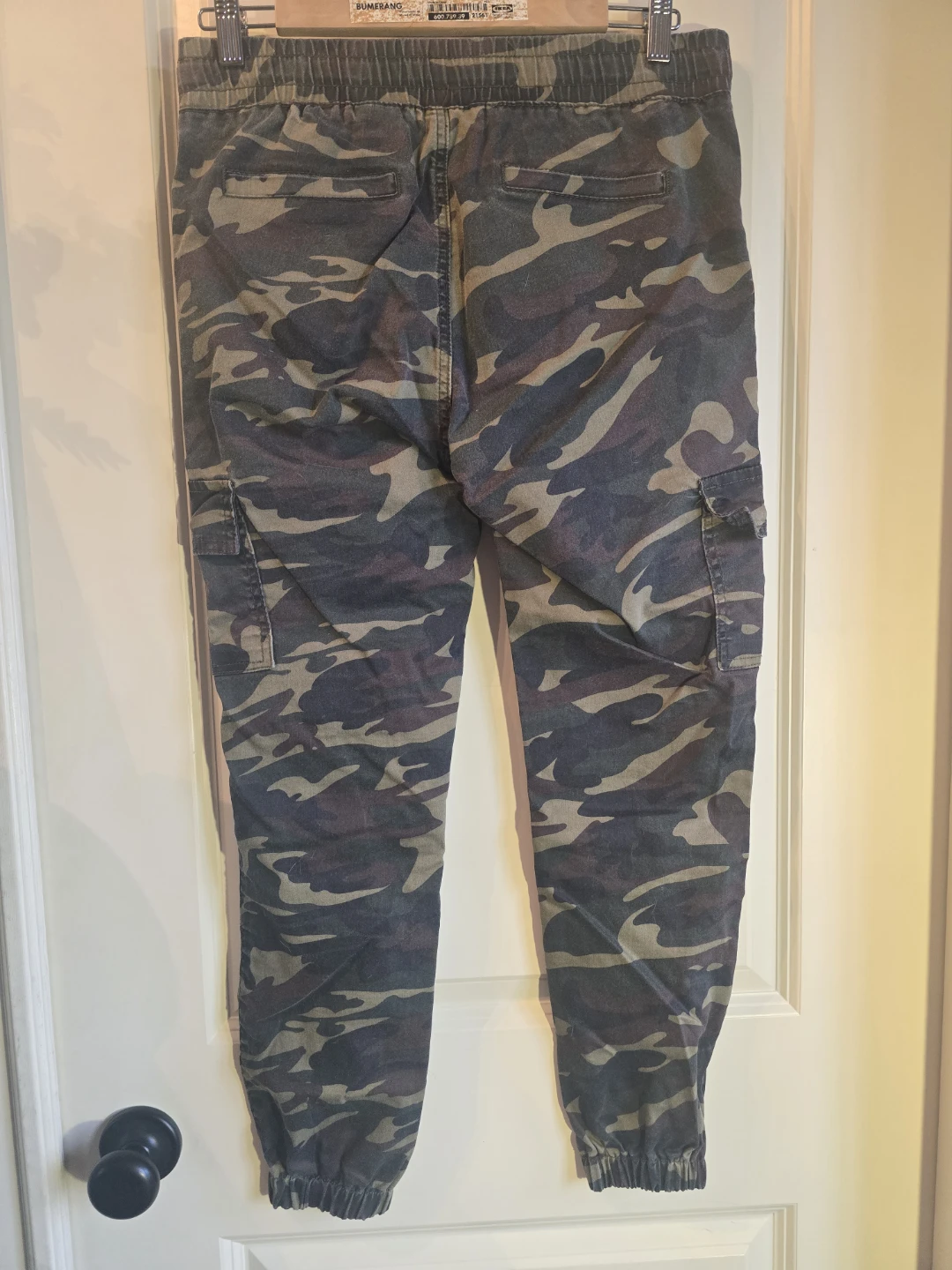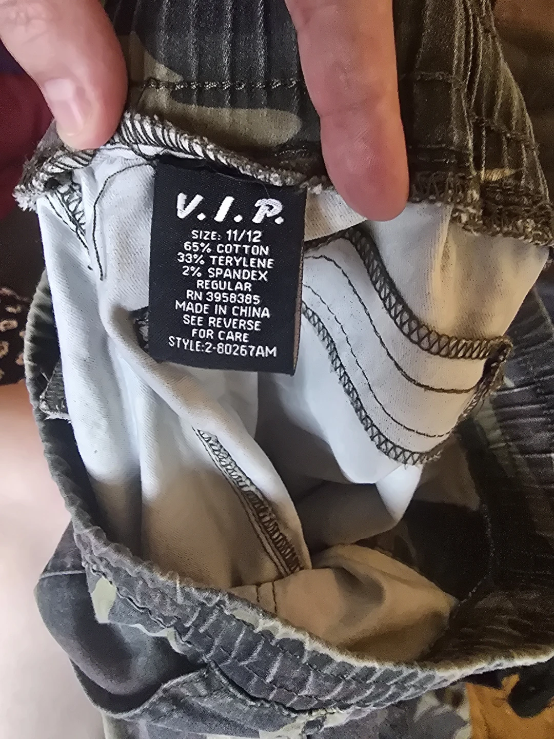 V.I.P. cargo jogger pants in a camouflage print. Size 11/12. These pants are made with 65% cotton, 33% Terylene, and 2% spandex. They're a regular fit with an elastic waistband and drawstring. Pockets on the front, back, and sides and fits small.