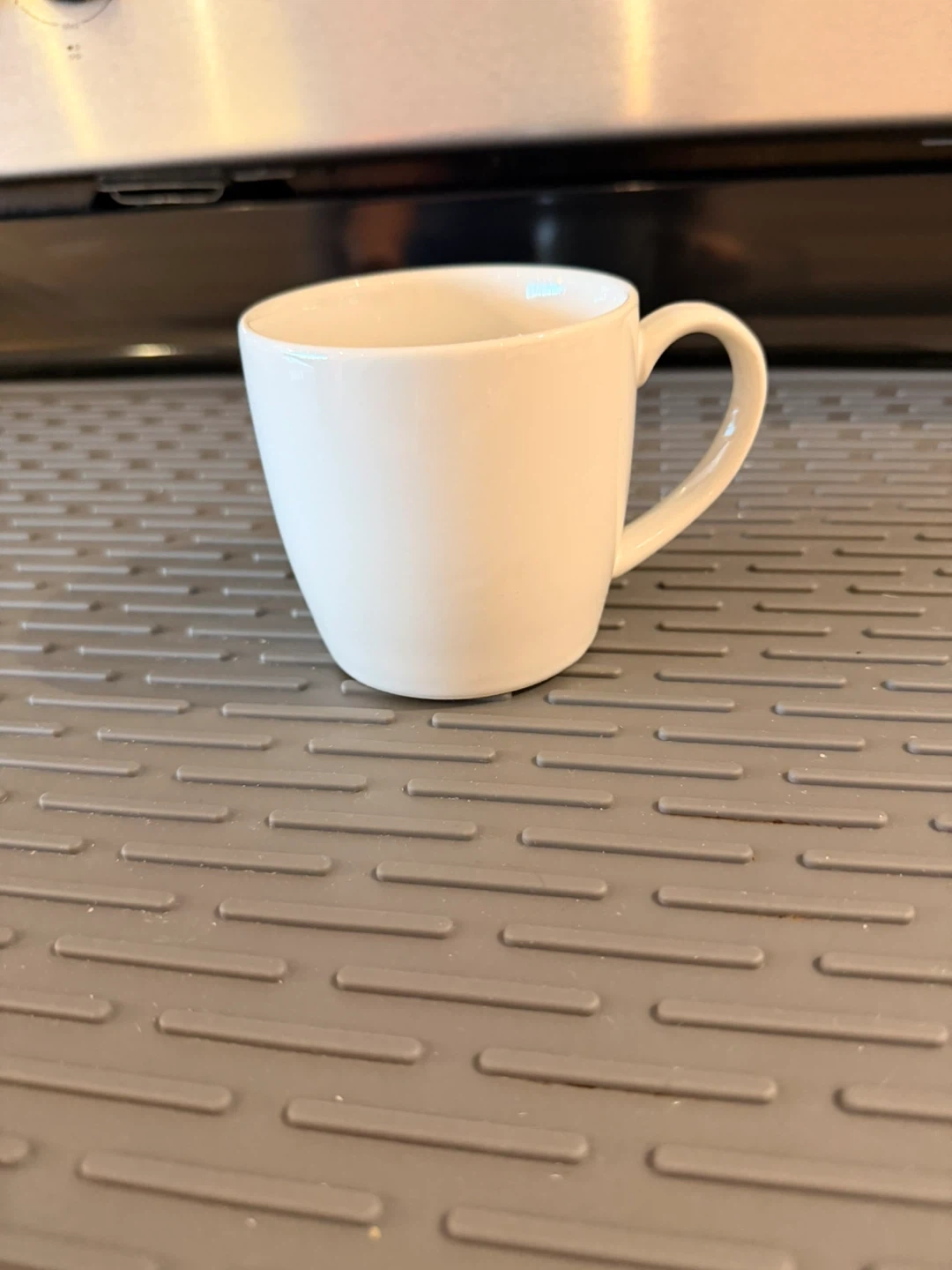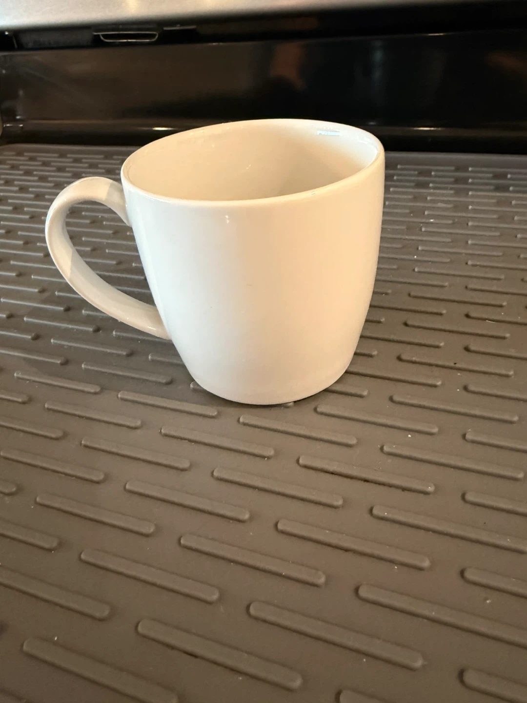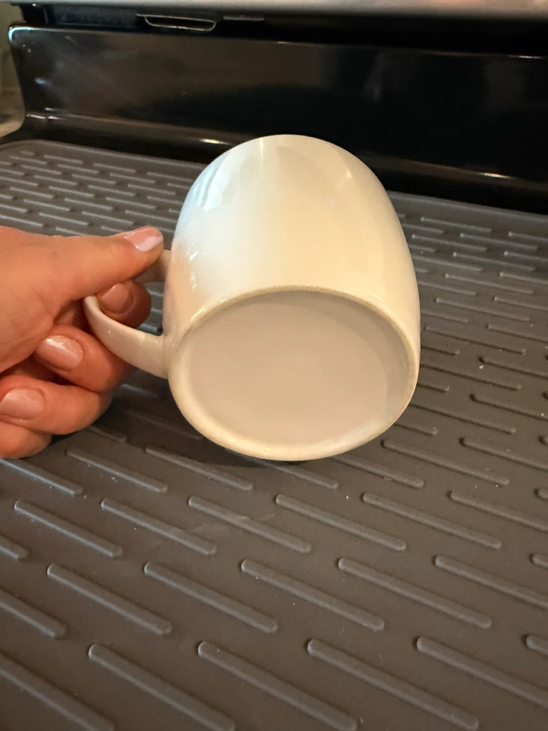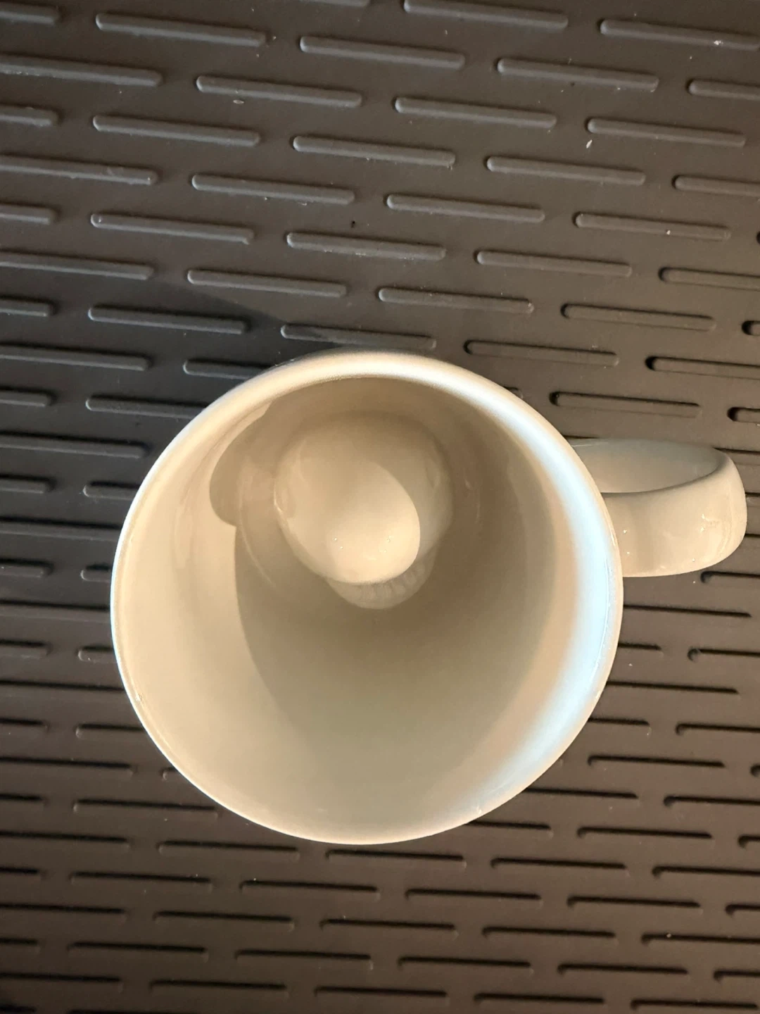 White ceramic mug featuring a novelty design with a shark's head and teeth at the bottom inside. It's made of durable ceramic material. This mug adds a bit of fun to your morning coffee or tea!