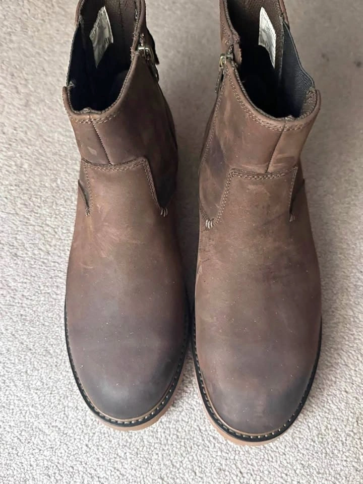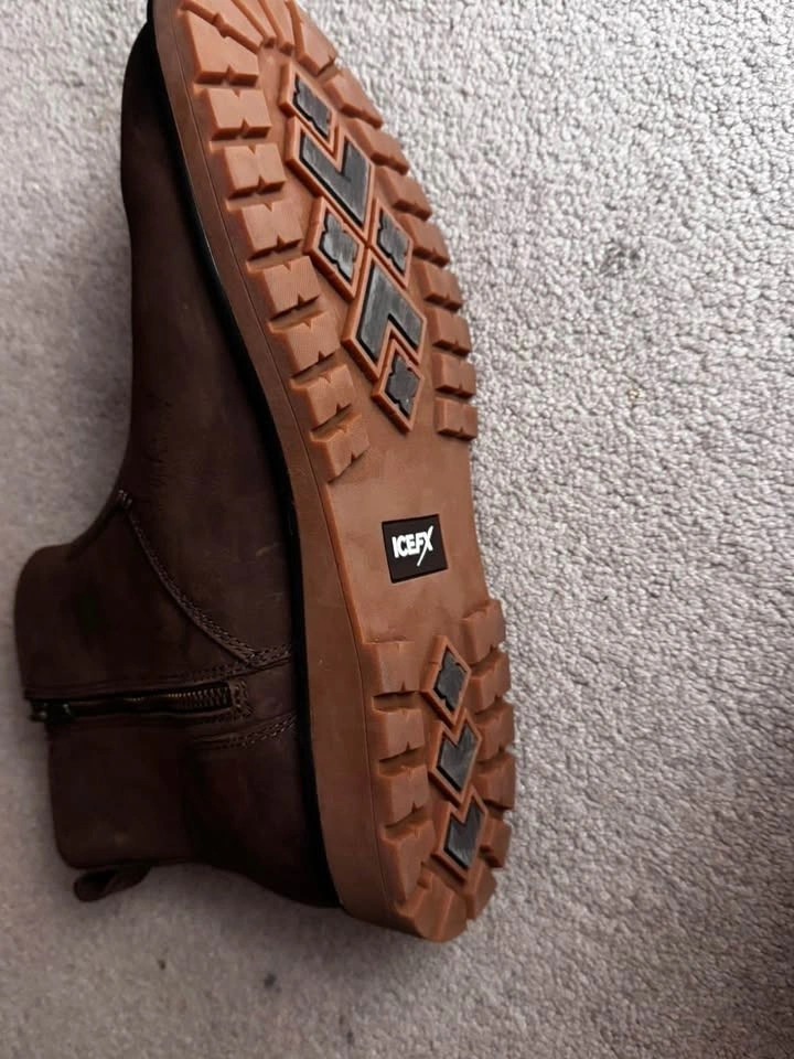 Brown ICEFx boots size 10. These have side zippers for easy on and off. Soles are chunky with good grip. Nice boots for everyday wear. Never wore them.