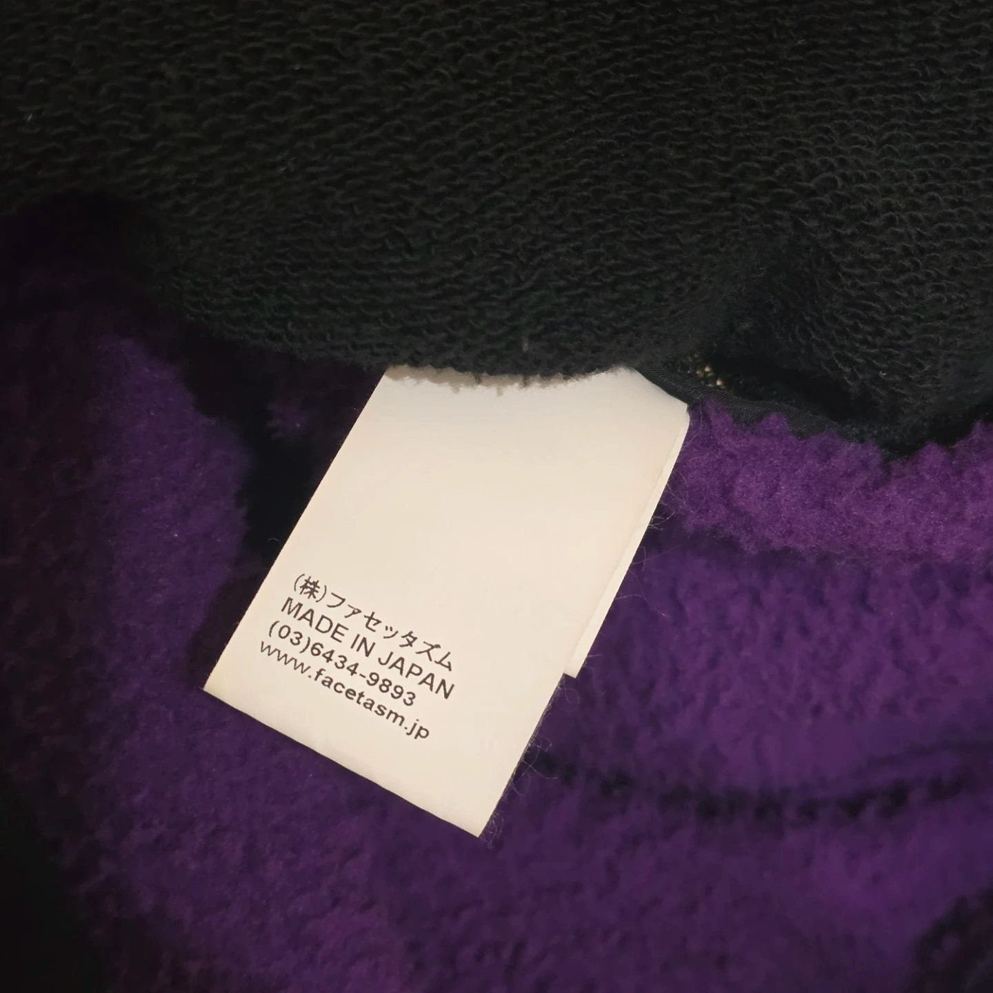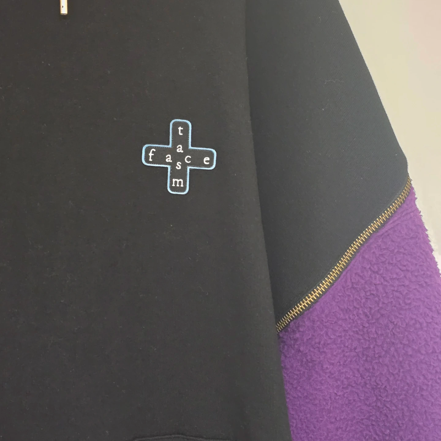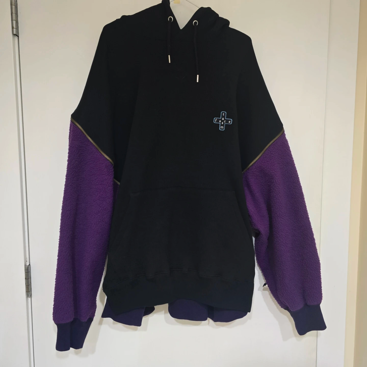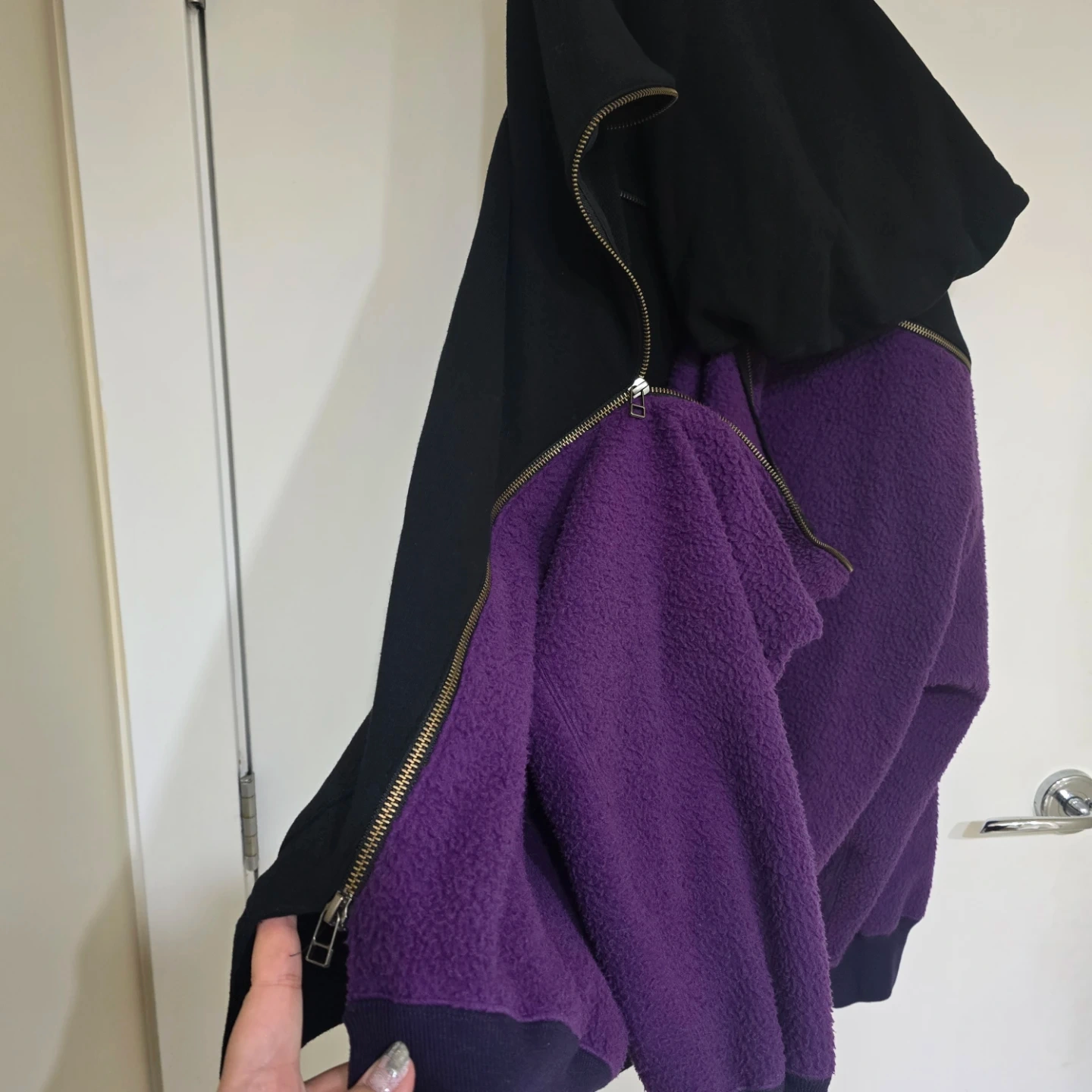 This is a black and purple fleece hoodie from Fasfce Canada. It features a zip-off fleece lower section and a contrasting black hood and upper body. The material is soft fleece. It ts free size over fit (around 3xl)
