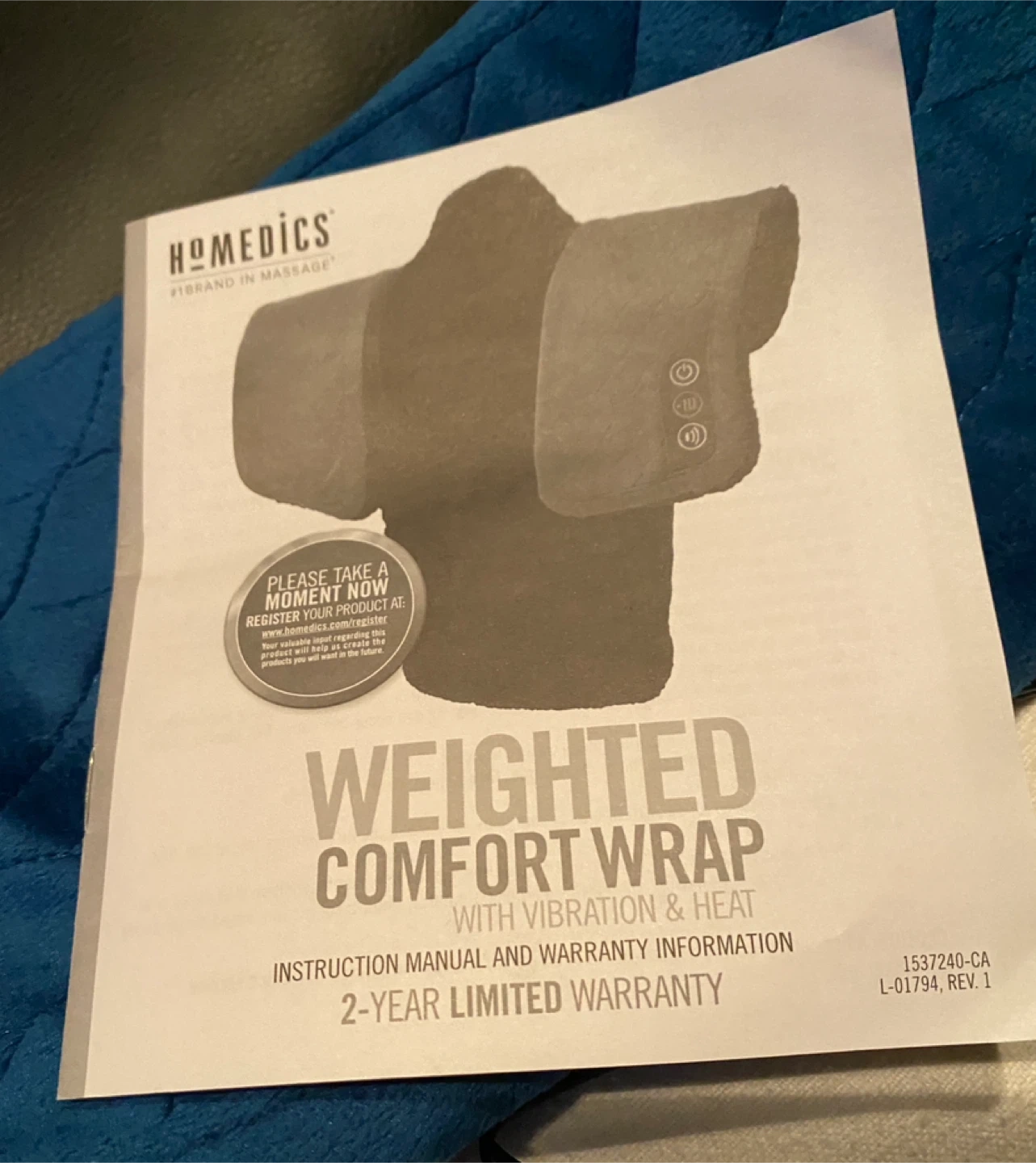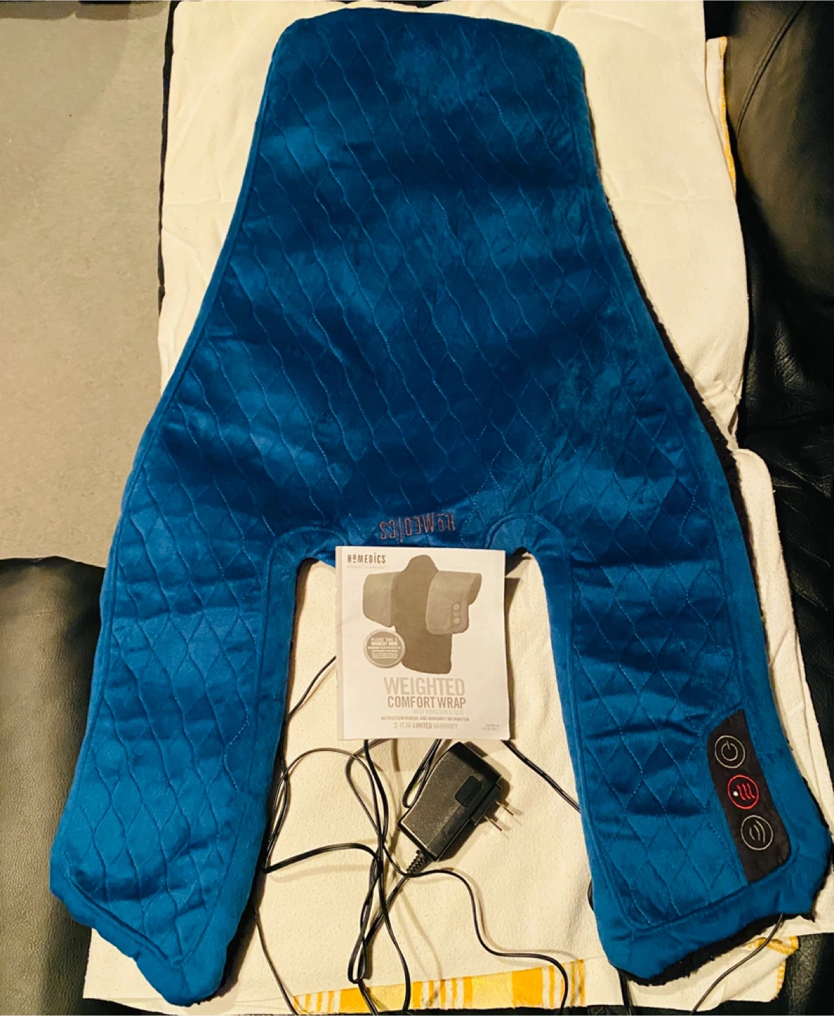 Weighted Comfort Wrap by Homedics, electrically heated (2 settings) with comforting vibrations (3 settings). NEW, $85. 204.661.4750