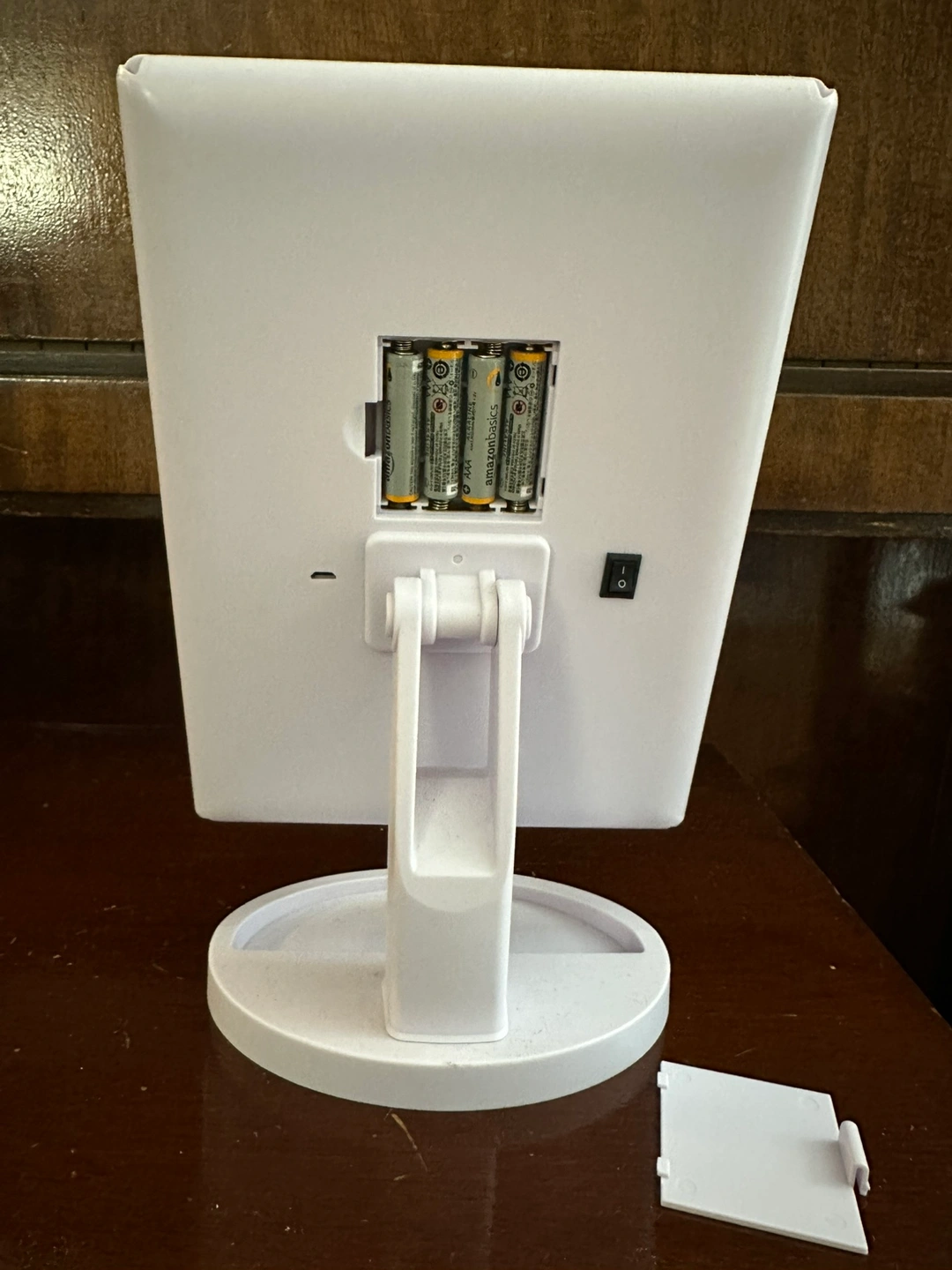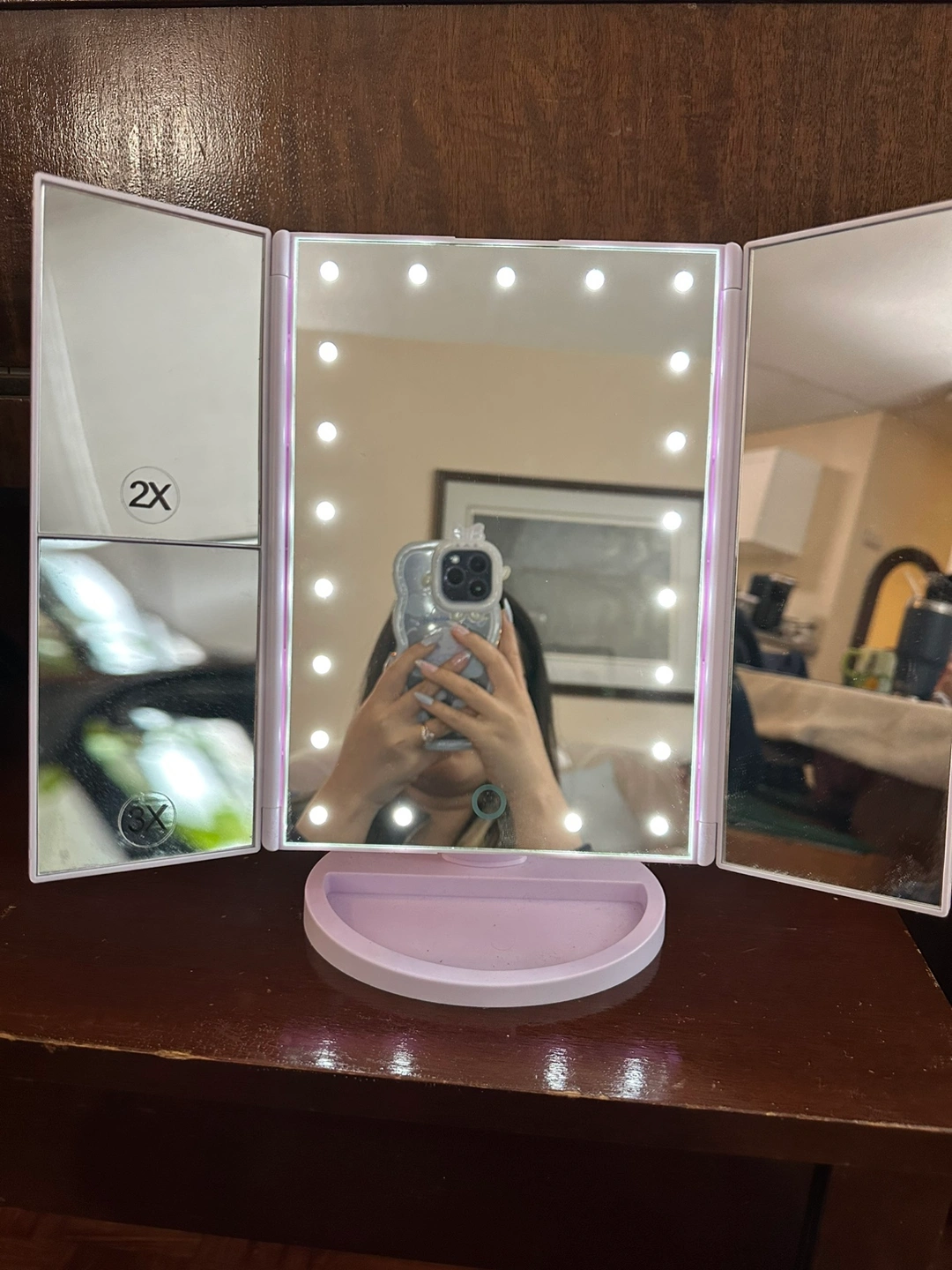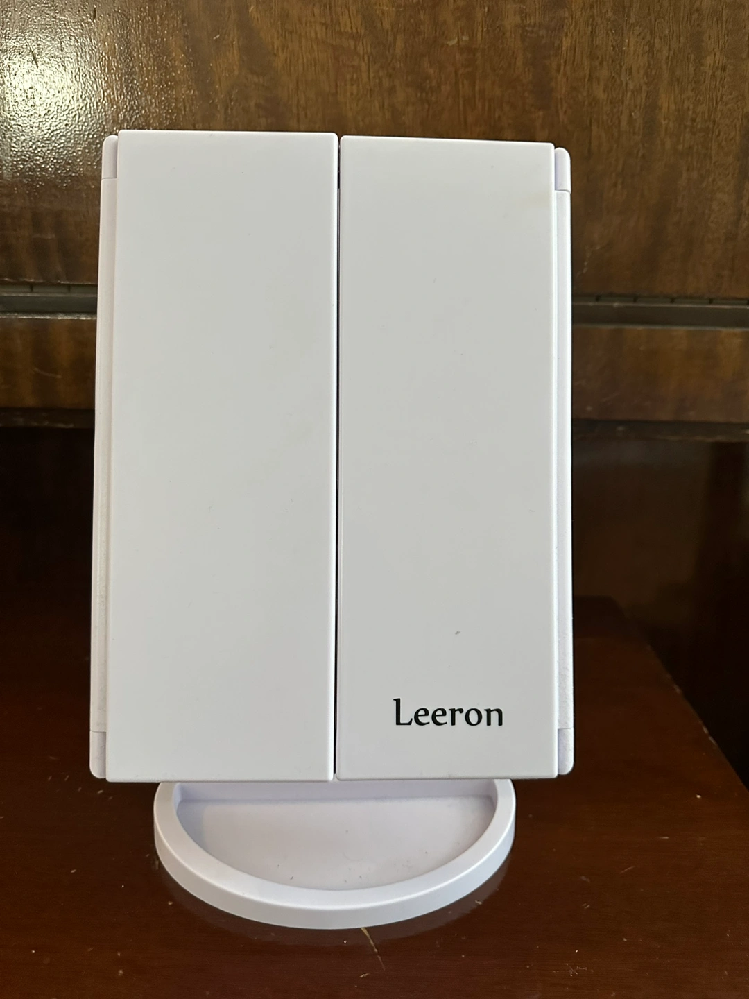 A lighted makeup mirror with 2x and 3x magnification. It is battery powered and comes with a small storage tray on the base.