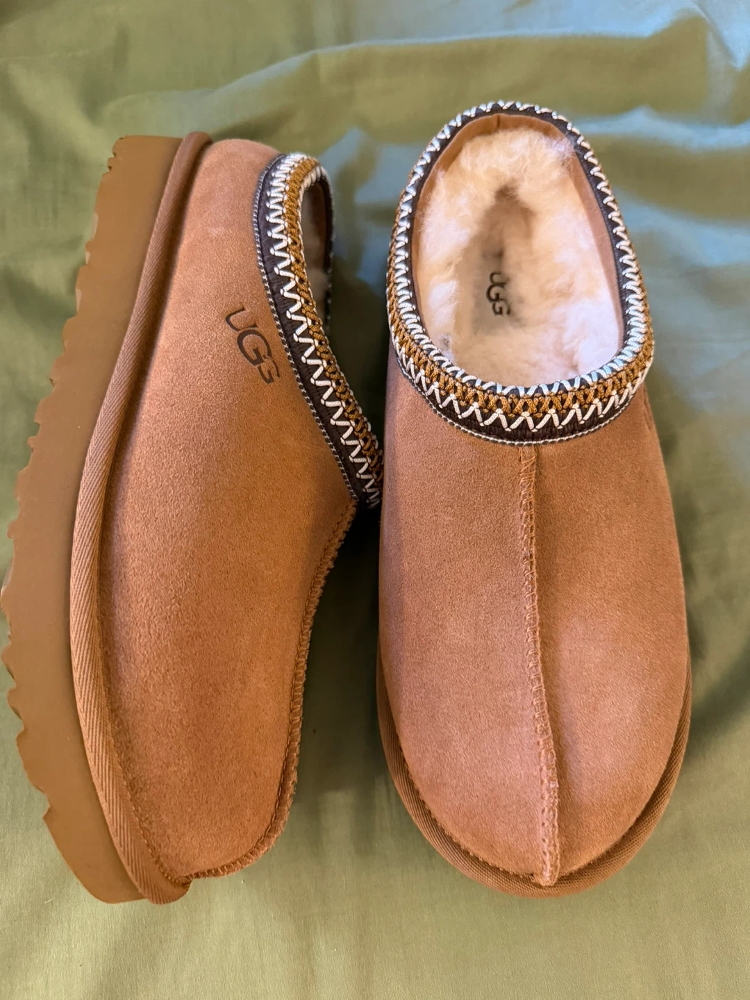 Cozy UGG slippers in a warm brown suede. Features genuine sheepskin lining for ultimate comfort. Made in Indonesia, these slippers are size 9 US. Perfect for keeping your feet warm!