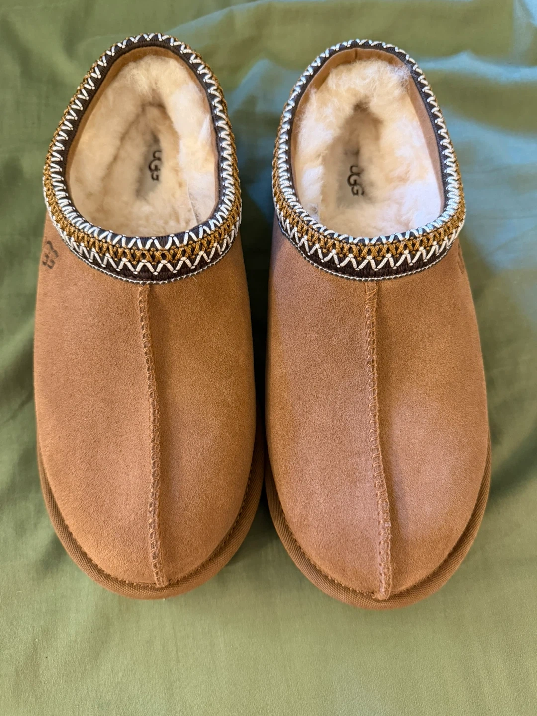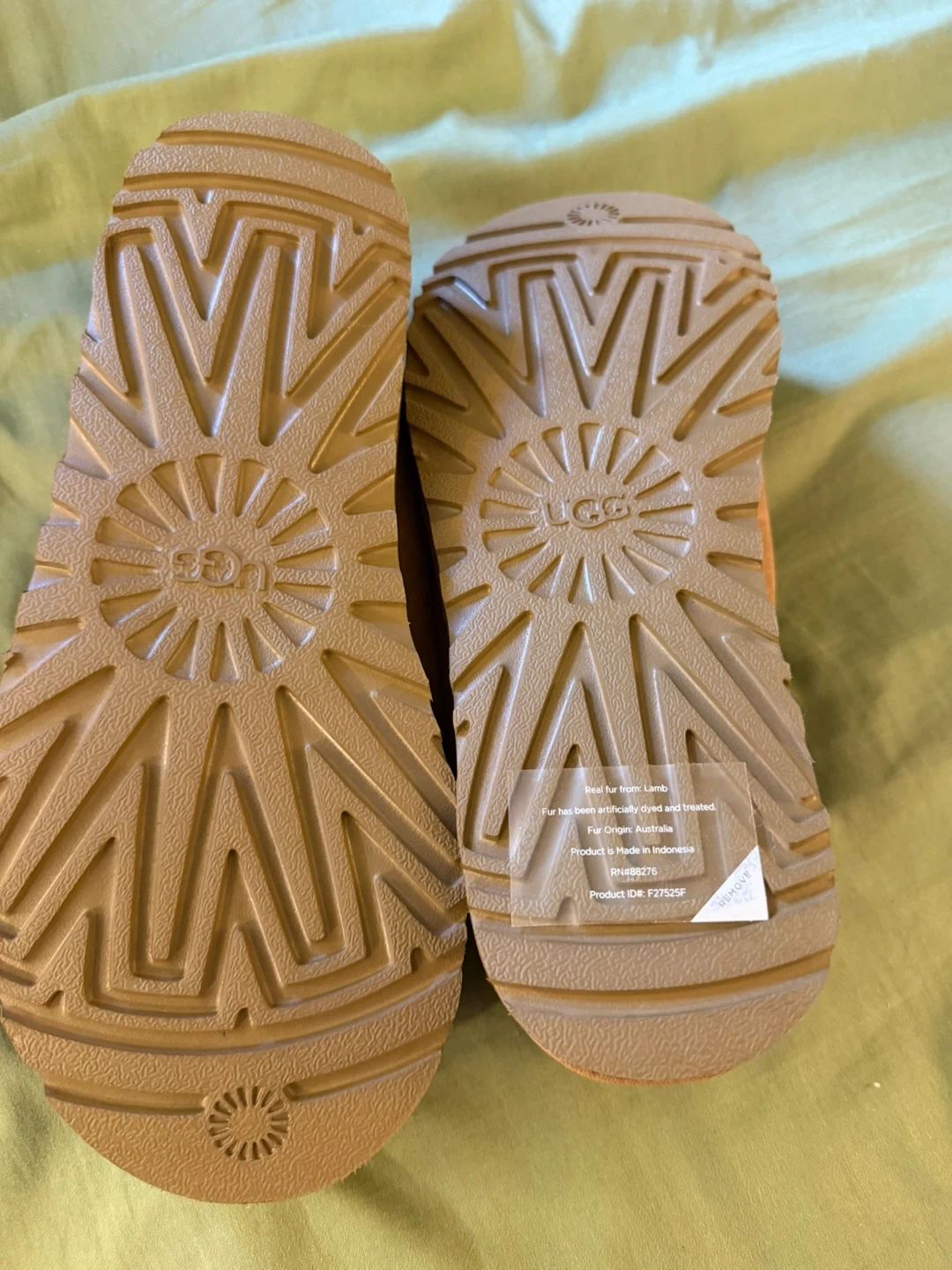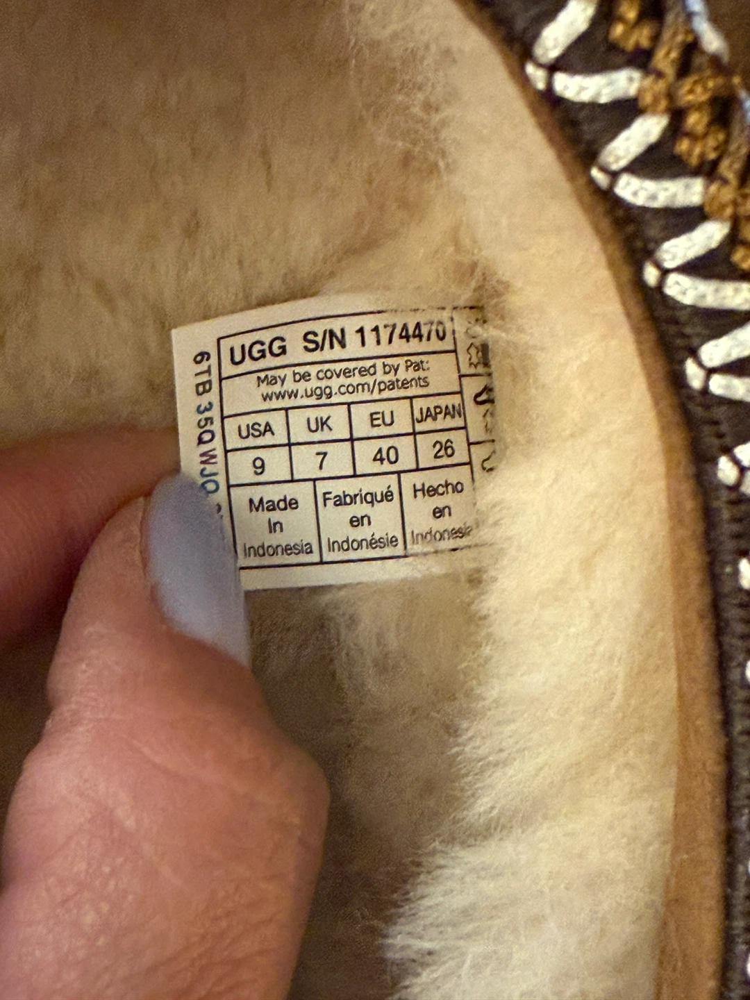 Cozy UGG slippers in a warm brown suede. Features genuine sheepskin lining for ultimate comfort. Made in Indonesia, these slippers are size 9 US. Perfect for keeping your feet warm!