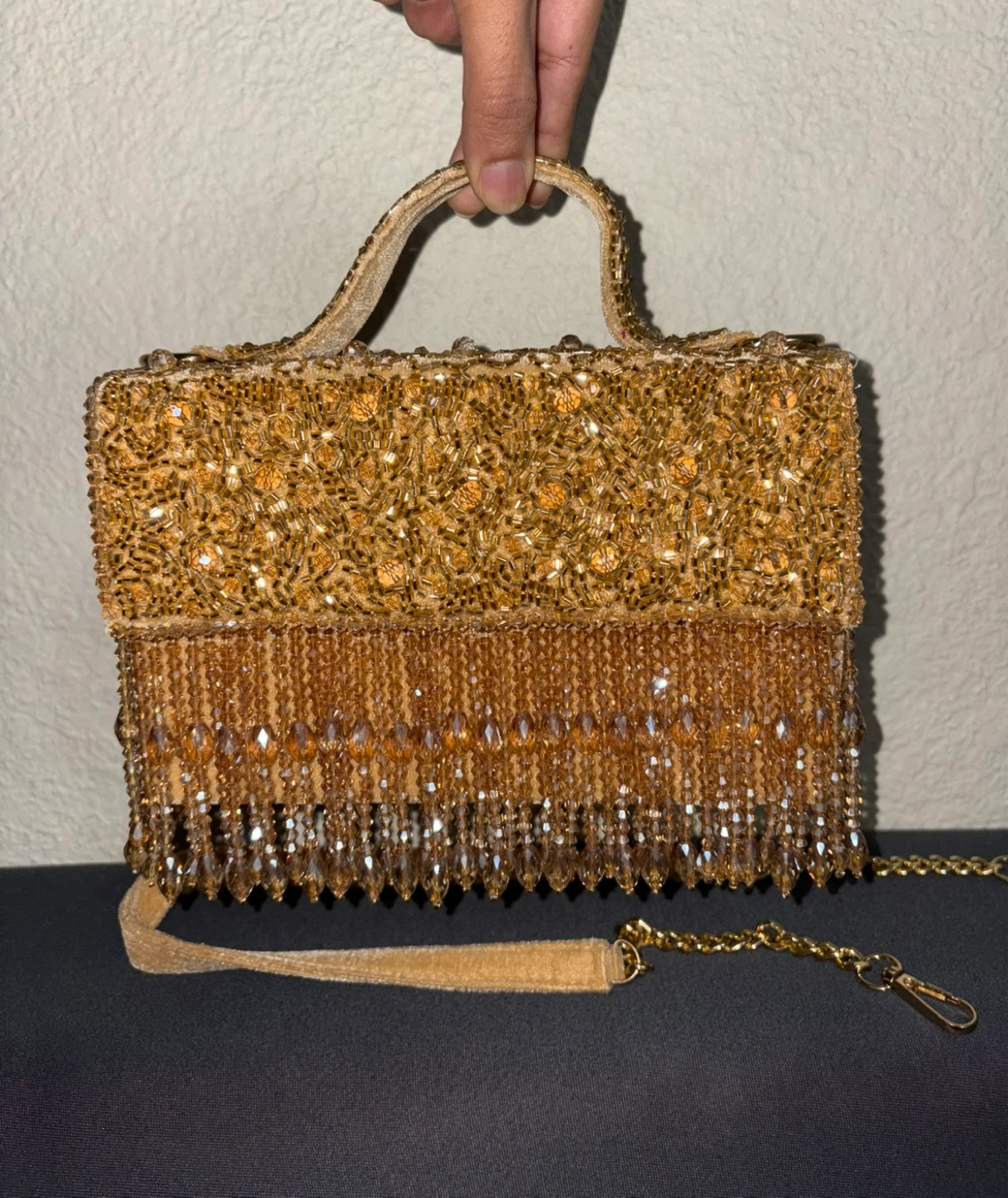 This is a stunning beaded evening handbag. It's covered in intricate beadwork and features a fringe of sparkling crystals. Comes with a removable gold chain strap.