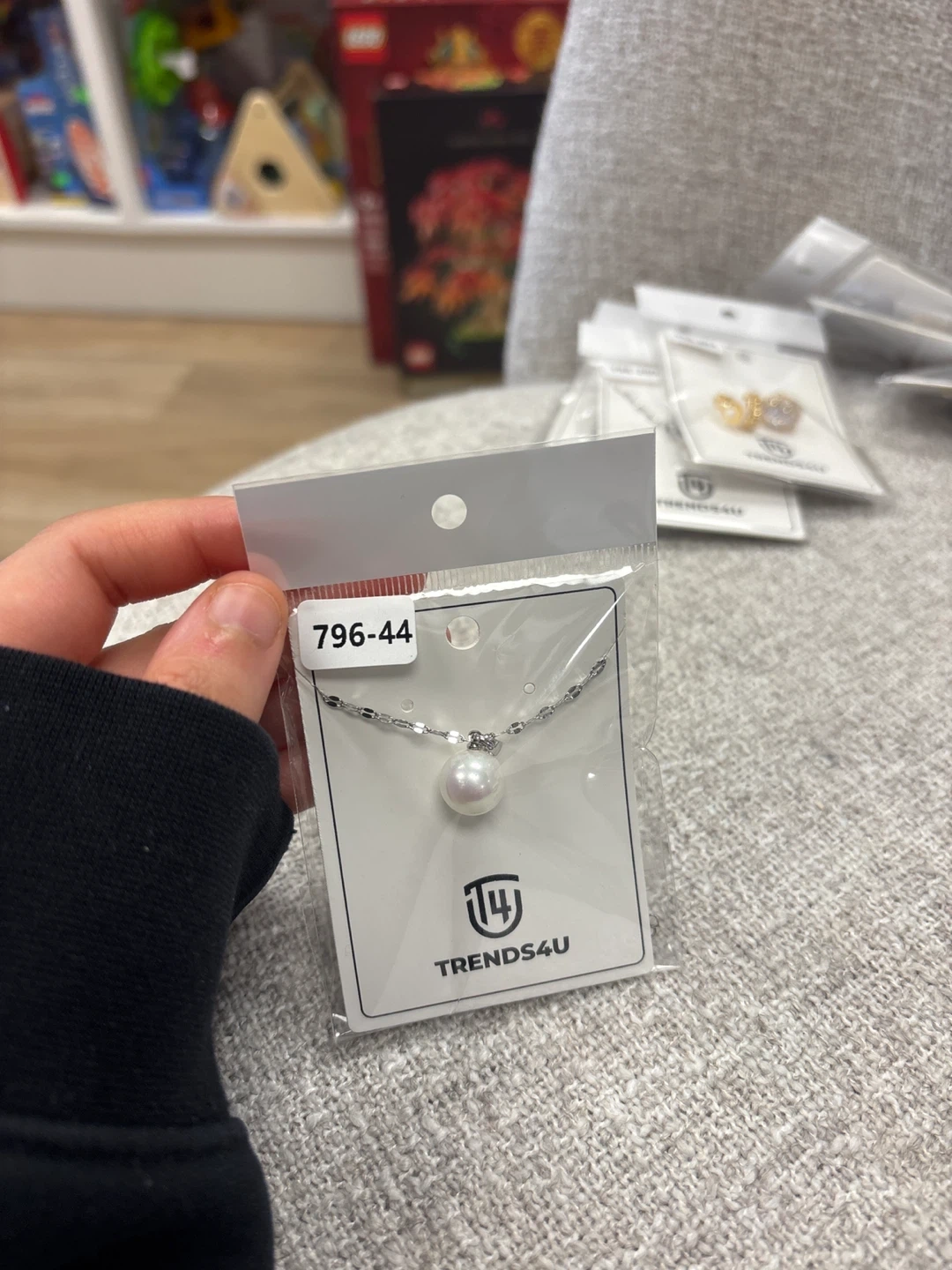 A delicate necklace from TRENDS4U featuring a single pearl pendant on a silver-tone chain. The chain is a fine, articulated design. This necklace is new and comes in its original packaging.