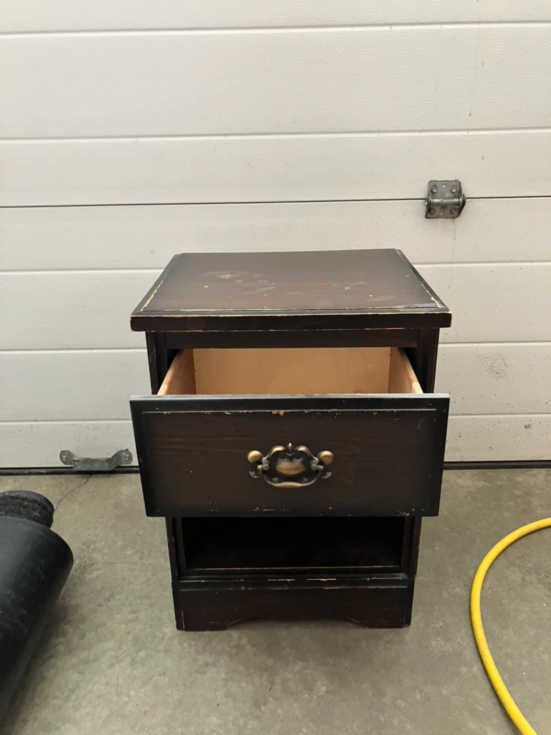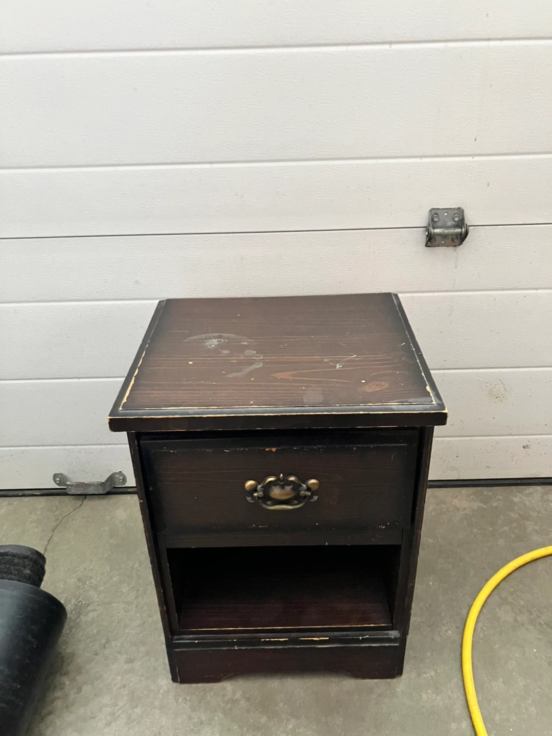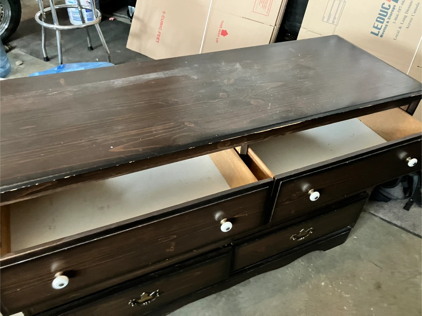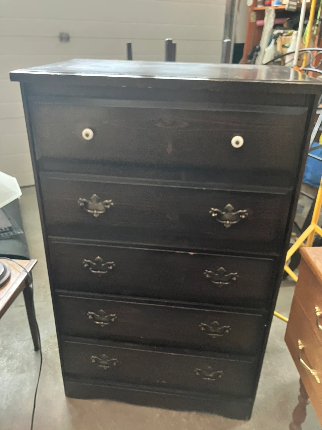 This set includes a five-drawer dresser and a one-drawer nightstand. Both pieces are dark wood with decorative drawer pulls and white knobs. They're great for bedroom storage! (3 in 1)