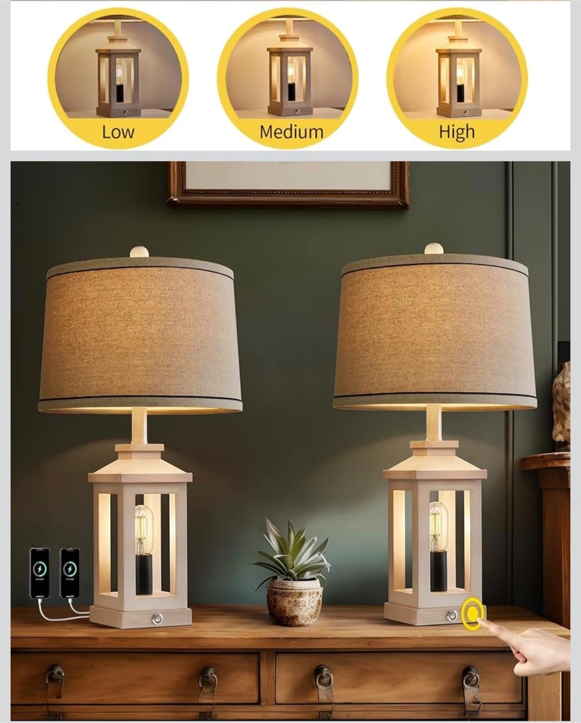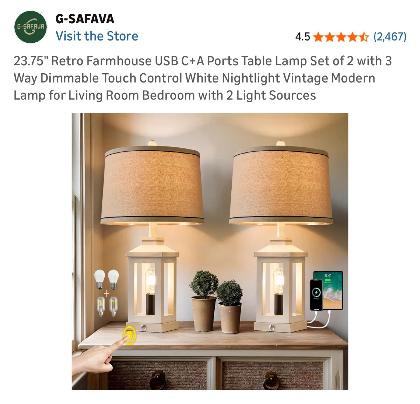 This set includes two G-Safava retro farmhouse table lamps. Each lamp features a 3-way dimmable touch control nightlight and two light sources. They're made of high-quality wood and metal material with a farmhouse style.