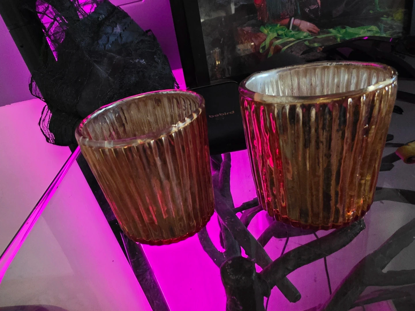Two amber glass votive candle holders with a ribbed texture. They have a metallic sheen and a slightly irregular rim. Perfect for adding a warm glow to any space!