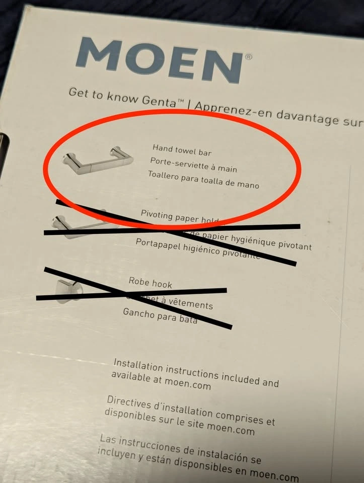 Brand new, never-used Moen Genta 8" chrome hand towel bar from collection Genta BH3893CH. This is for the towel bar ONLY. Selling because I needed the toilet paper holder and towel hook instead. Screws and anchors are included.