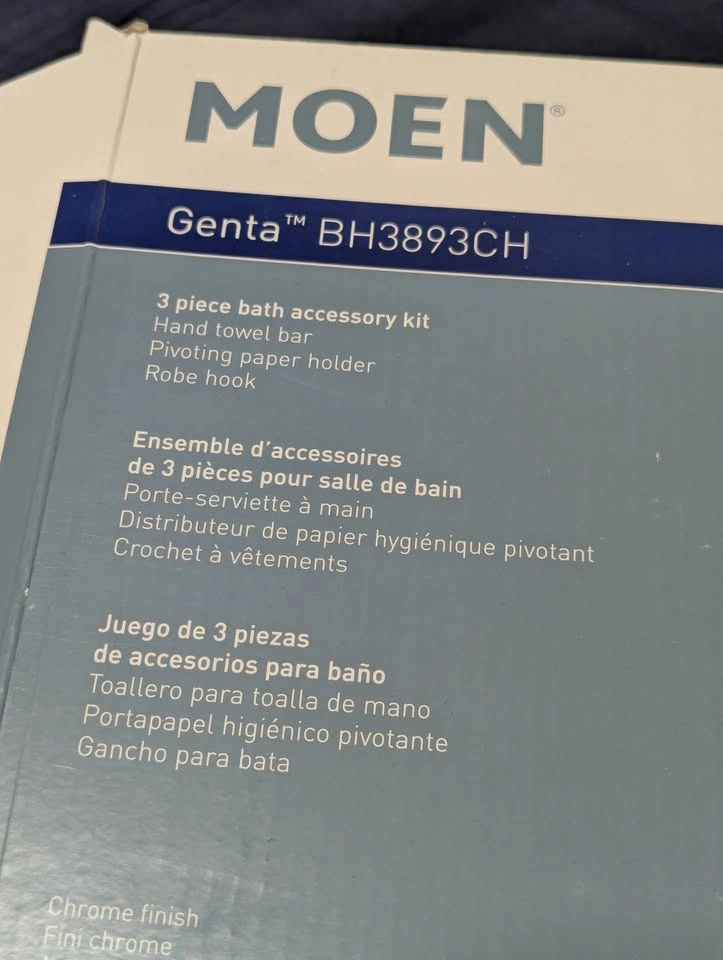 Brand new, never-used Moen Genta 8" chrome hand towel bar from collection Genta BH3893CH. This is for the towel bar ONLY. Selling because I needed the toilet paper holder and towel hook instead. Screws and anchors are included.